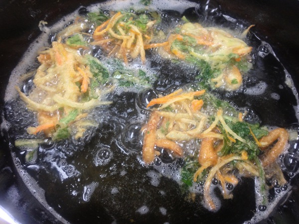 ⑨ Put the kakiage ingredients into a bowl, add the remaining batter, and mix coarsely. Use a wooden spatula to gather up one serving of the mixture. Slide the spatula into the oil to let the kakiage mixture separate from the spatula. Instead of the spatula approach, you can cut cooking (baking) paper into 7cm (little less than 3in.) squares, place the kakiage mixture on these squares and then slide them (the paper, too) into the oil.