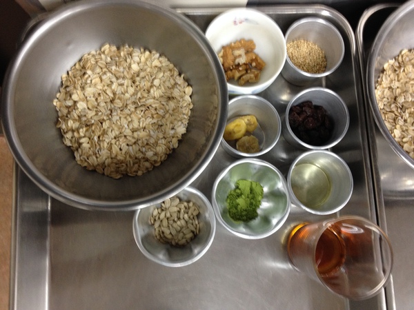 ① Add the honey, salt, and oatmeal to a large bowl and mix well. Add the matcha and mix well. Add the oil and mix. Roughly chop the walnuts and add them together with the sesame and sunflower seeds. Mix well.