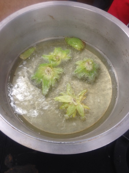 For the fukinotō buds, open the petals, and then place each bud into the oil with the petals facing down. Once each bud hardens with the petals open, turn it over, let it brown lightly and then transfer to a paper towel or metal rack.