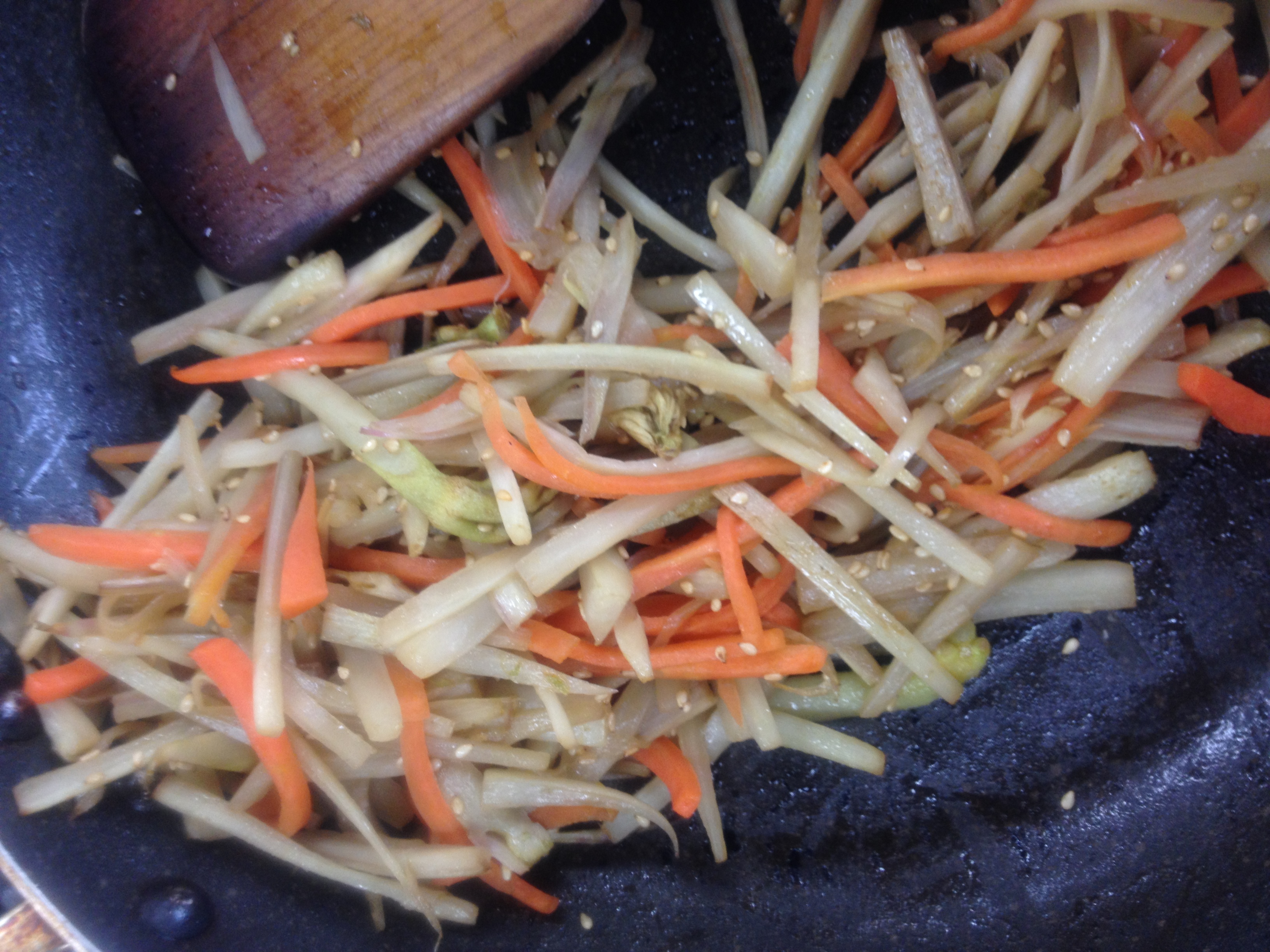 ② Pour the sesame oil into a frying pan and turn on the heat. Fry the udo and carrots. Once they soften, add the sugar and soy sauce, and mix. Continue frying until most of the water has evaporated.