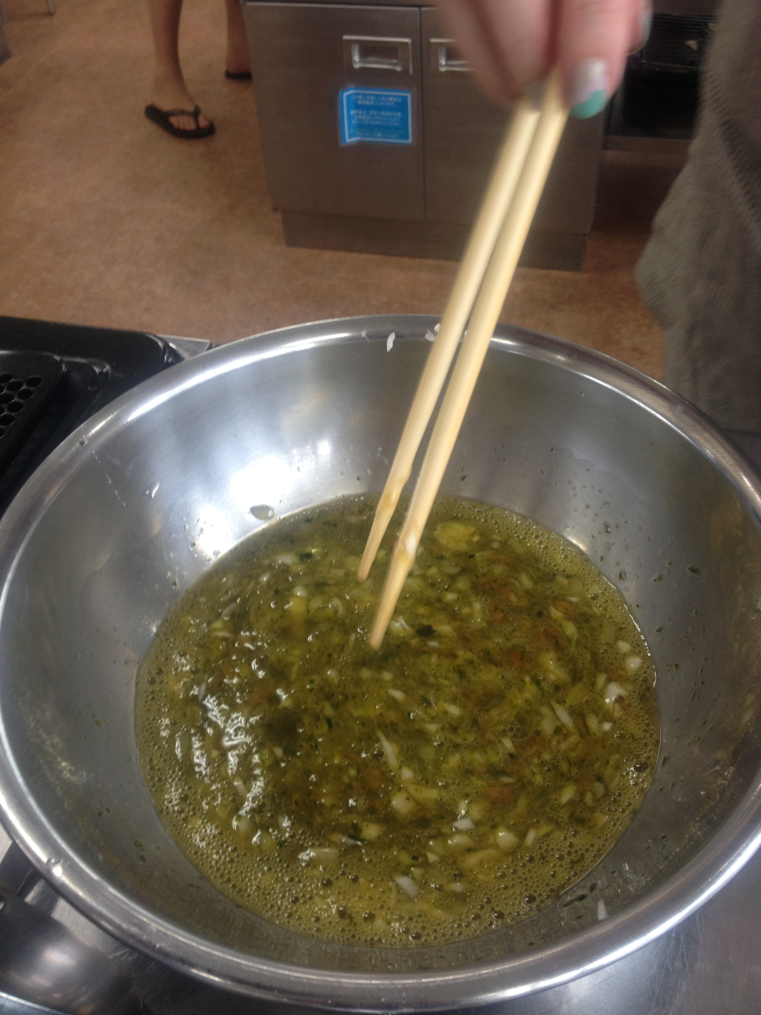 ① Use a pair of chopsticks to mix the nattō until the threads quickly break when you pick up a quantity with the chopsticks. Mince the green onion.