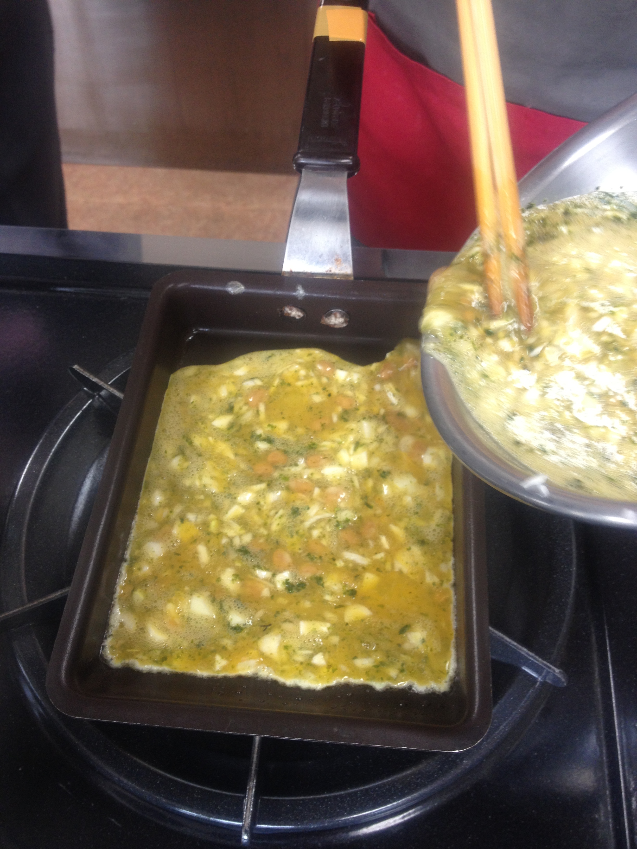 ③ Heat a tamagoyaki pan and add just enough sesame oil to spread thinly in the pan. Pour in 1/4 of the egg mixture. When the egg is half-cooked and the edges are fully cooked, use a pair of cooking chopsticks to roll up the egg toward you. Push the rolled-up egg to the side of the pan away from you and add another 1/4 of the egg mixture. Let it cook as described above and roll as described above. Do this two more times.