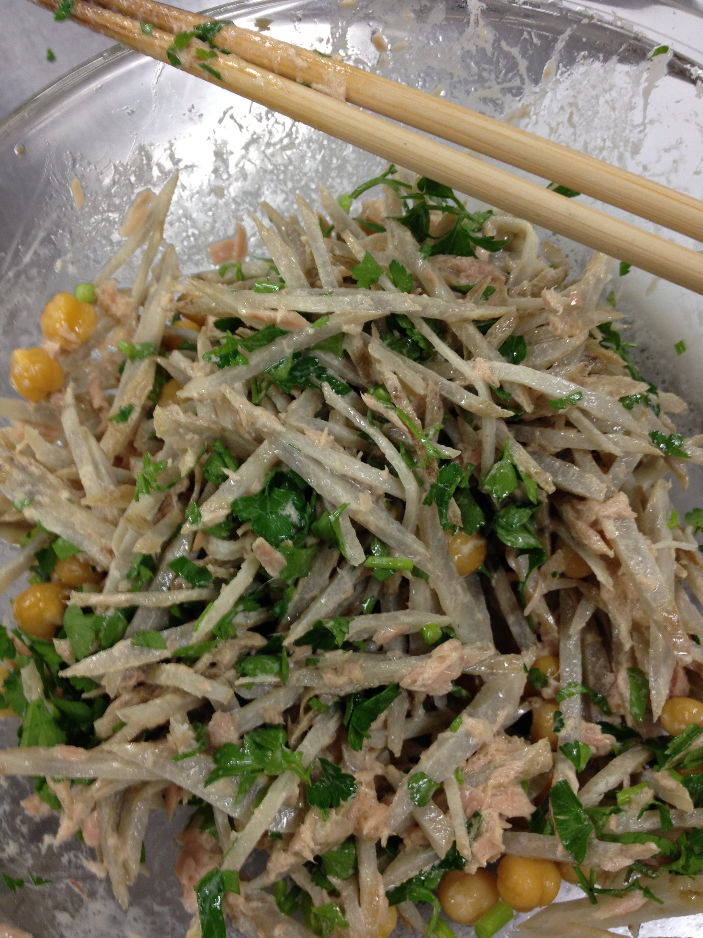② Add the burdock root, garbanzo beans, tuna (drained of its oil), mayonnaise, salt, and black pepper to a mixing bowl and mix.