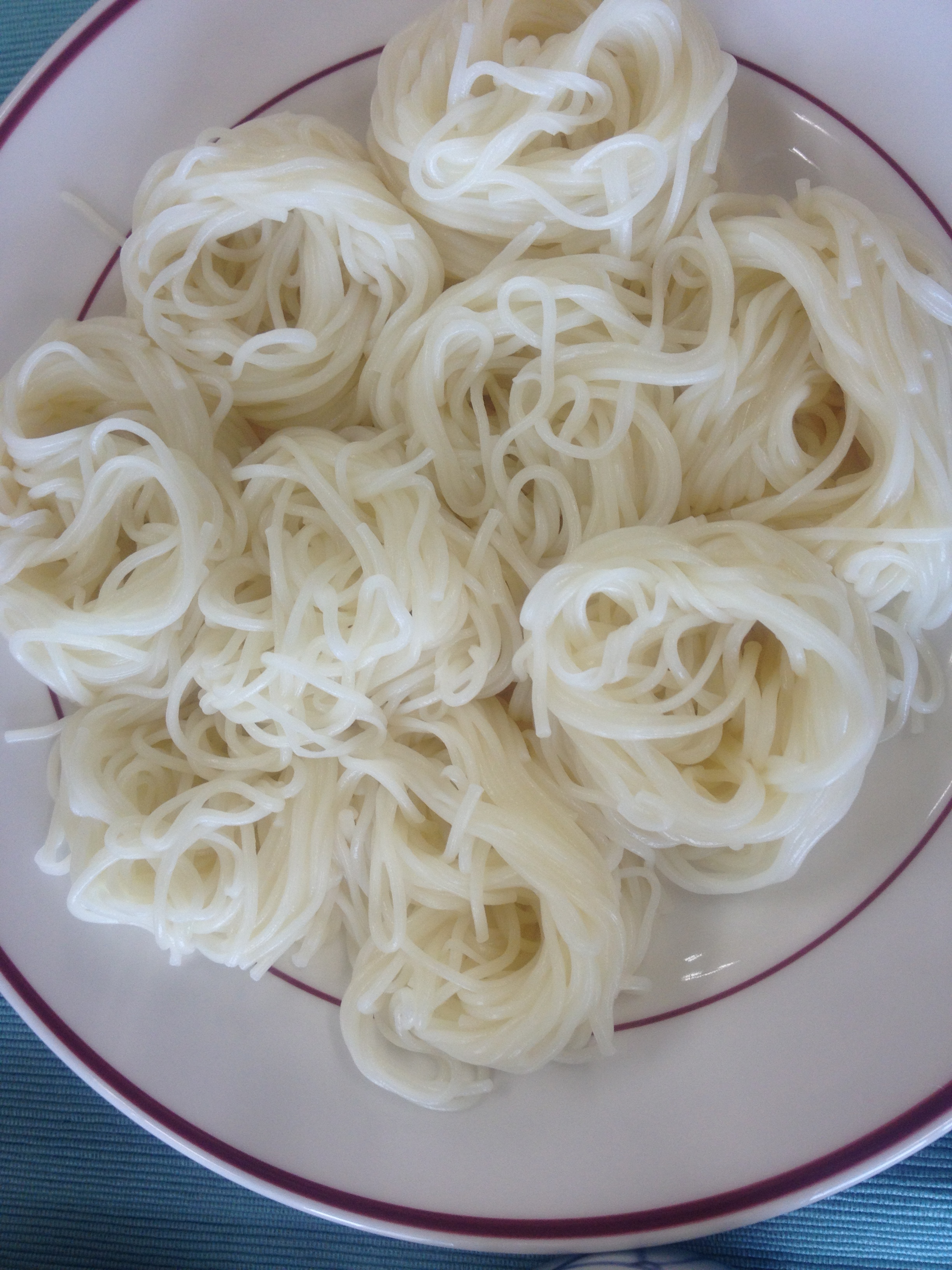 ① Boil water (at least 1 liter [or quart] per 100g of dry noodles) in a soup pot. Once the water is at a boil, put in the sōmen noodles and boil them for 1 minute. Transfer the noodles to a strainer and rinse under running water. The noodles will feel slippery. Rinse until that slipperiness disappears and then drain.