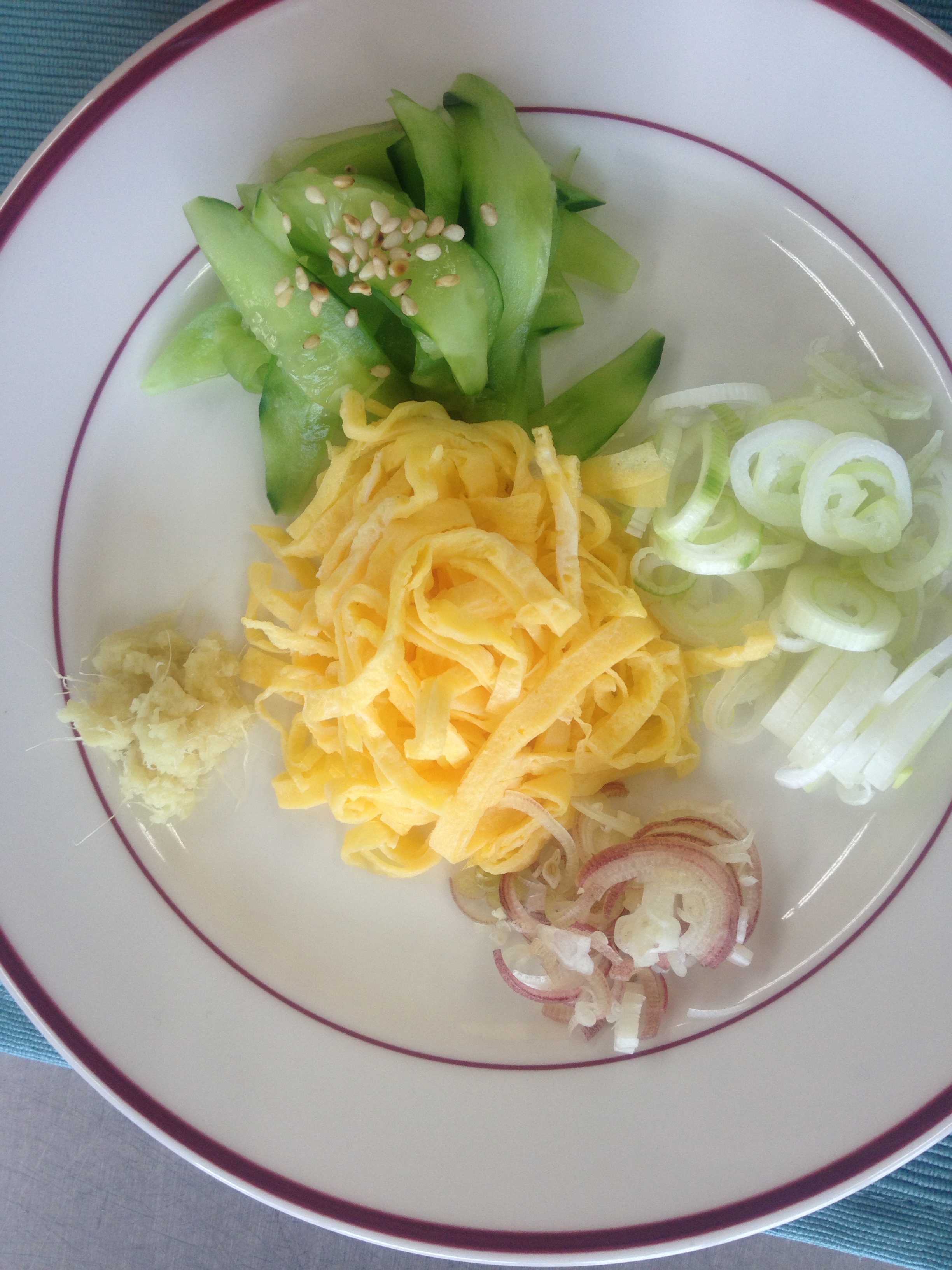 Cut the myōga into thin diagonal slices and finely chop the green onion. Use the myōga, green onion, and ground ginger as you like when eating your sōmen.