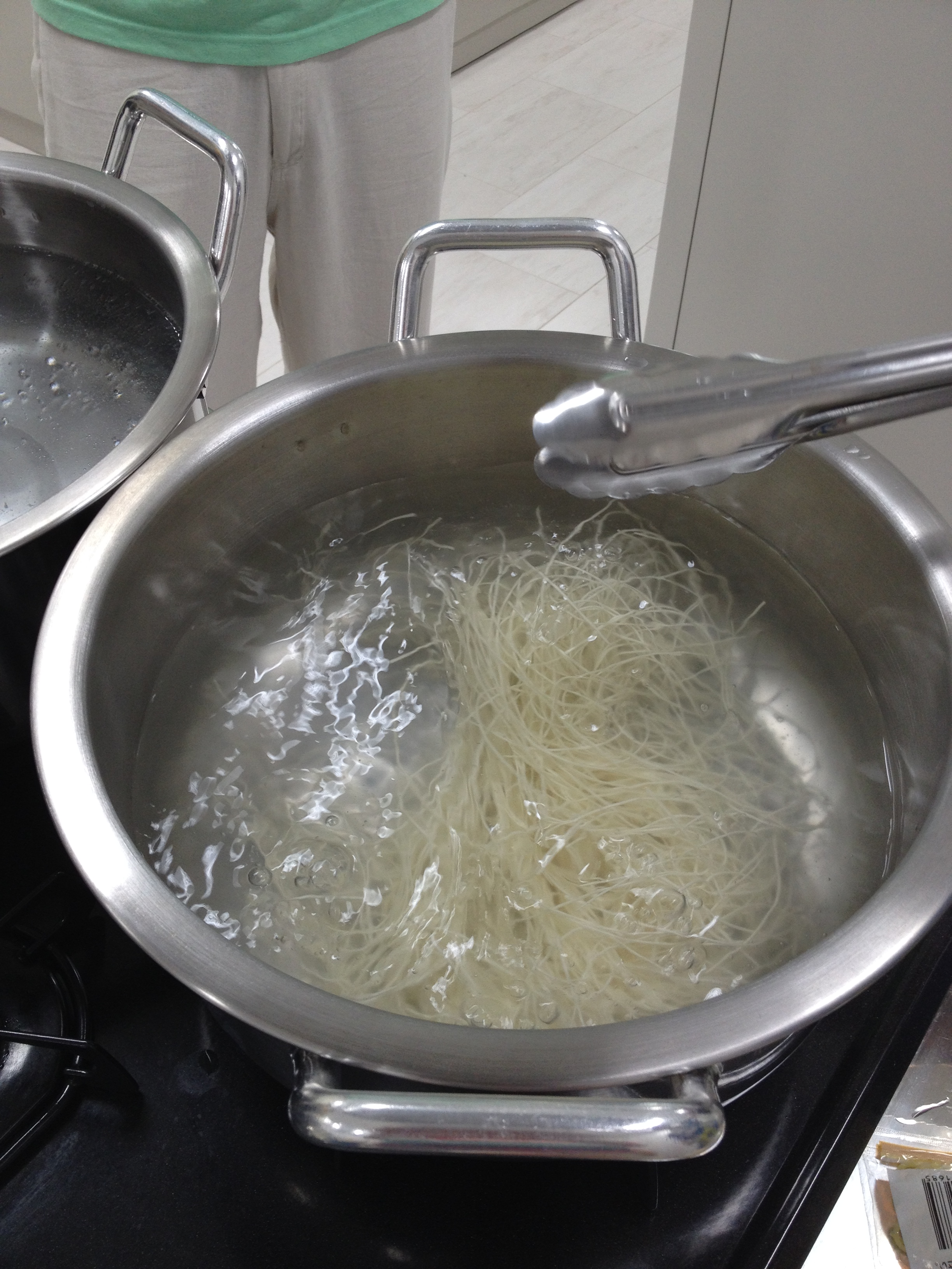 Fill a medium-to-large-size pot mostly full with water. Bring this to a boil. Place the sōmen noodles into the boiling water, taking care to let them spread out. Boil for 1 minute, dump the contents of the pot into a strainer and then transfer the noodles from the strainer to a mixing bowl or pot filled with cold water. Use your hands to rinse the noodles in the cold water, changing the water 2-3 times. Finally drain off the rinse water.
