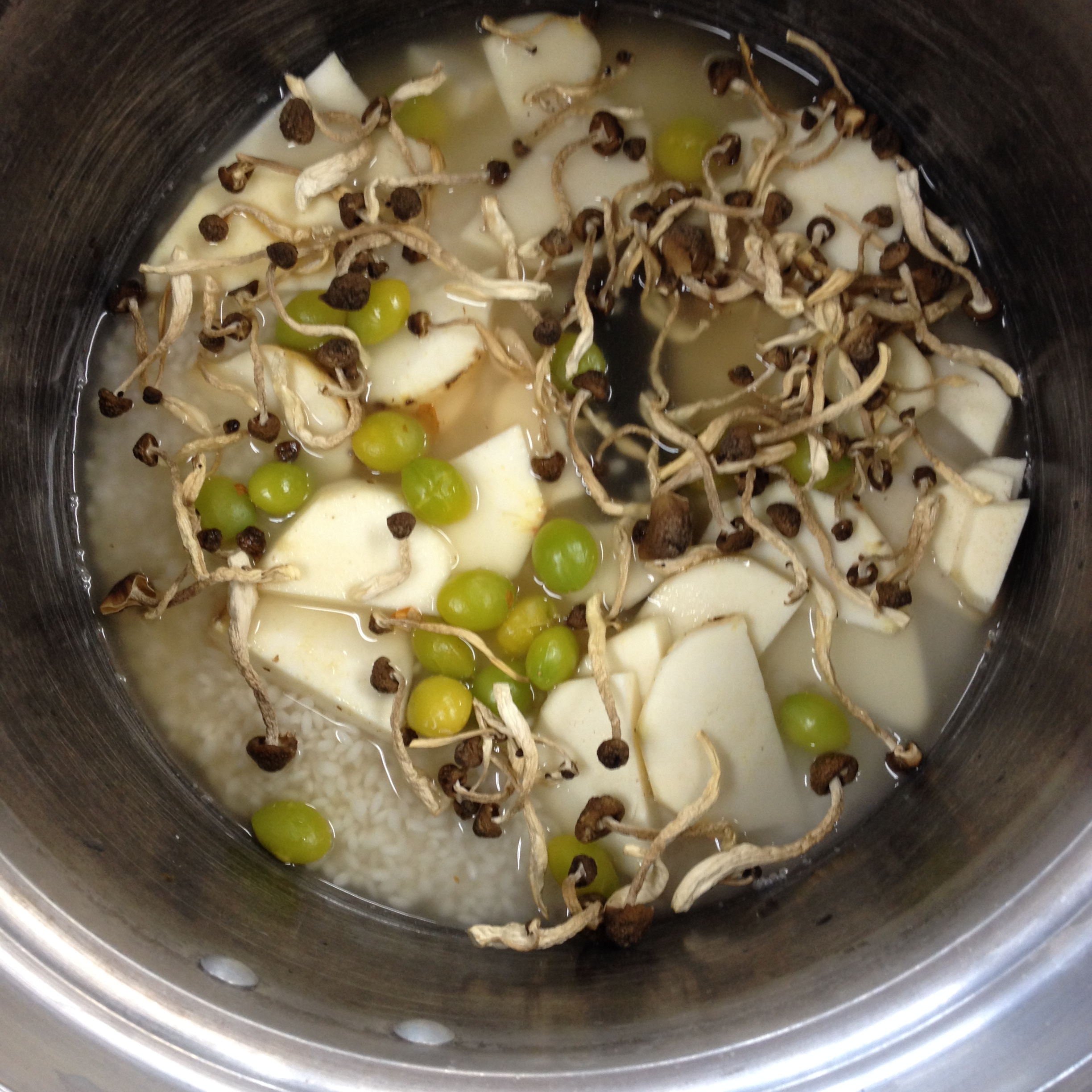⑤ Add the rice, water, konbu, sake, light soy sauce, and salt to a rice pot and mix thoroughly. Level off the top of the rice and place the shimeji mushrooms, sato imo, and peeled gingko nuts on top.