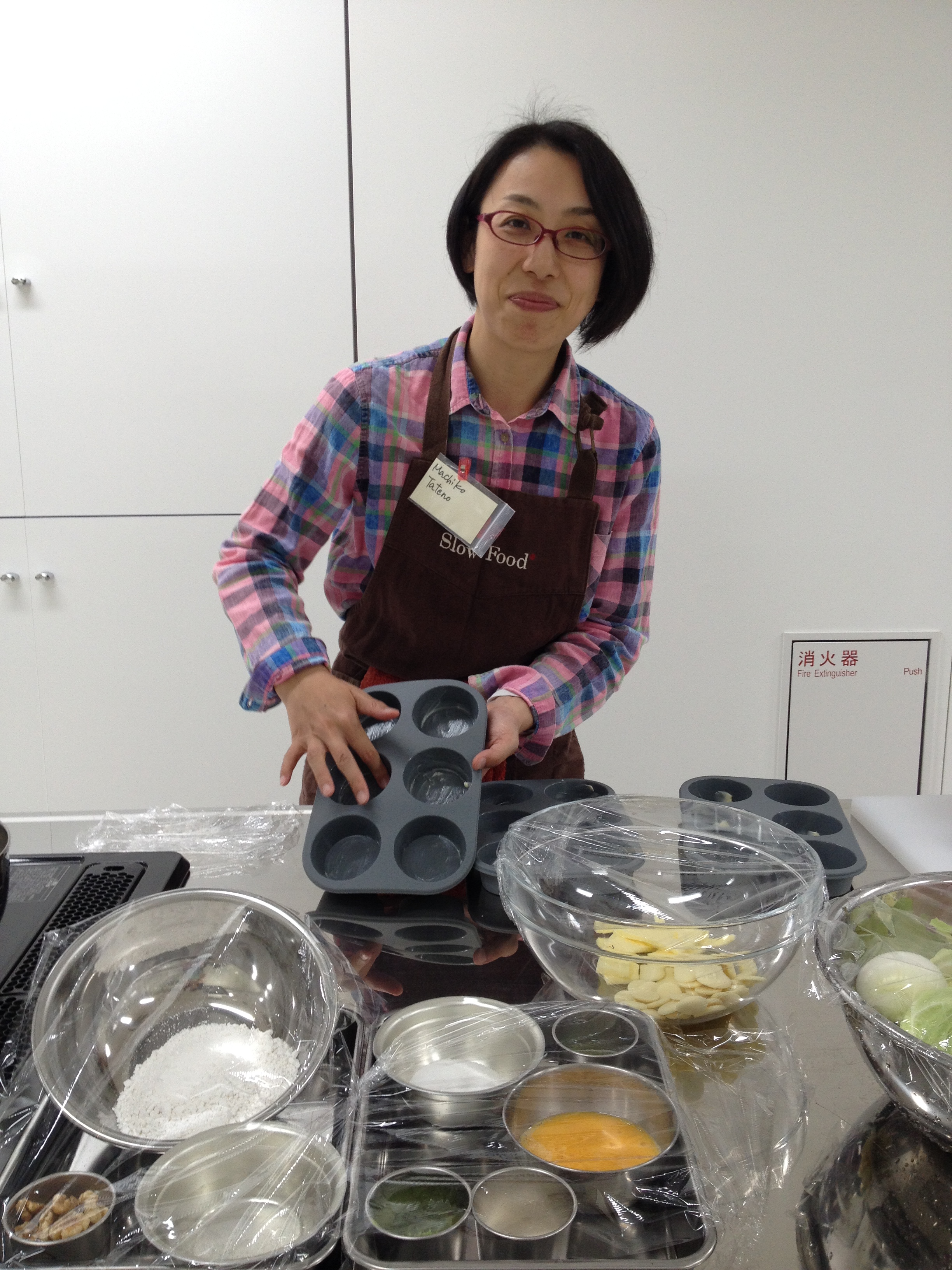 5. Preheat an oven to 170℃. Place the muffin tin on a cookie sheet, add water to the cookie sheet, filling to a depth of 1cm. Place the cookie sheet in the oven and bake for 45 minutes or until the tops of the muffins are browned.