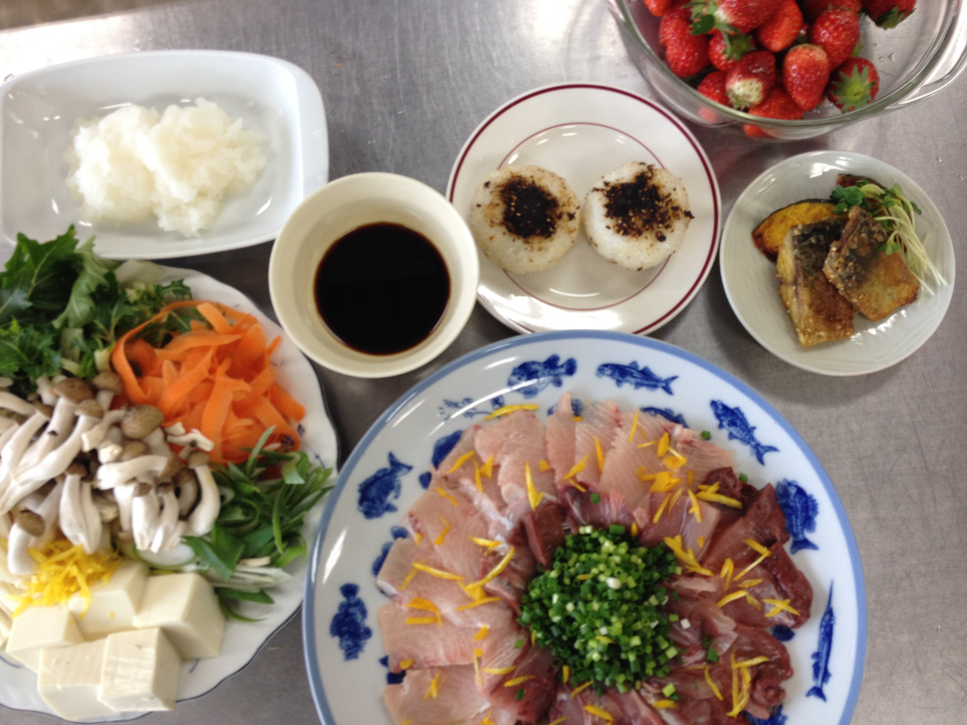 ⑤ Begin heating the stock again. Once the stock comes up to a low boil, begin eating in shabu-shabu style. In the case of the sliced vegetables, add them little by little to the hot stock and leave them in only long enough to warm them up or bring them to your desired level of doneness. After removing a slice of vegetable dip in the ponzu and enjoy. For the yellowtail, use chopsticks to grab individual pieces, dip/swish them in the stock only a few seconds, leaving the inside half cooked or raw, and then dip in the ponzu before eating.