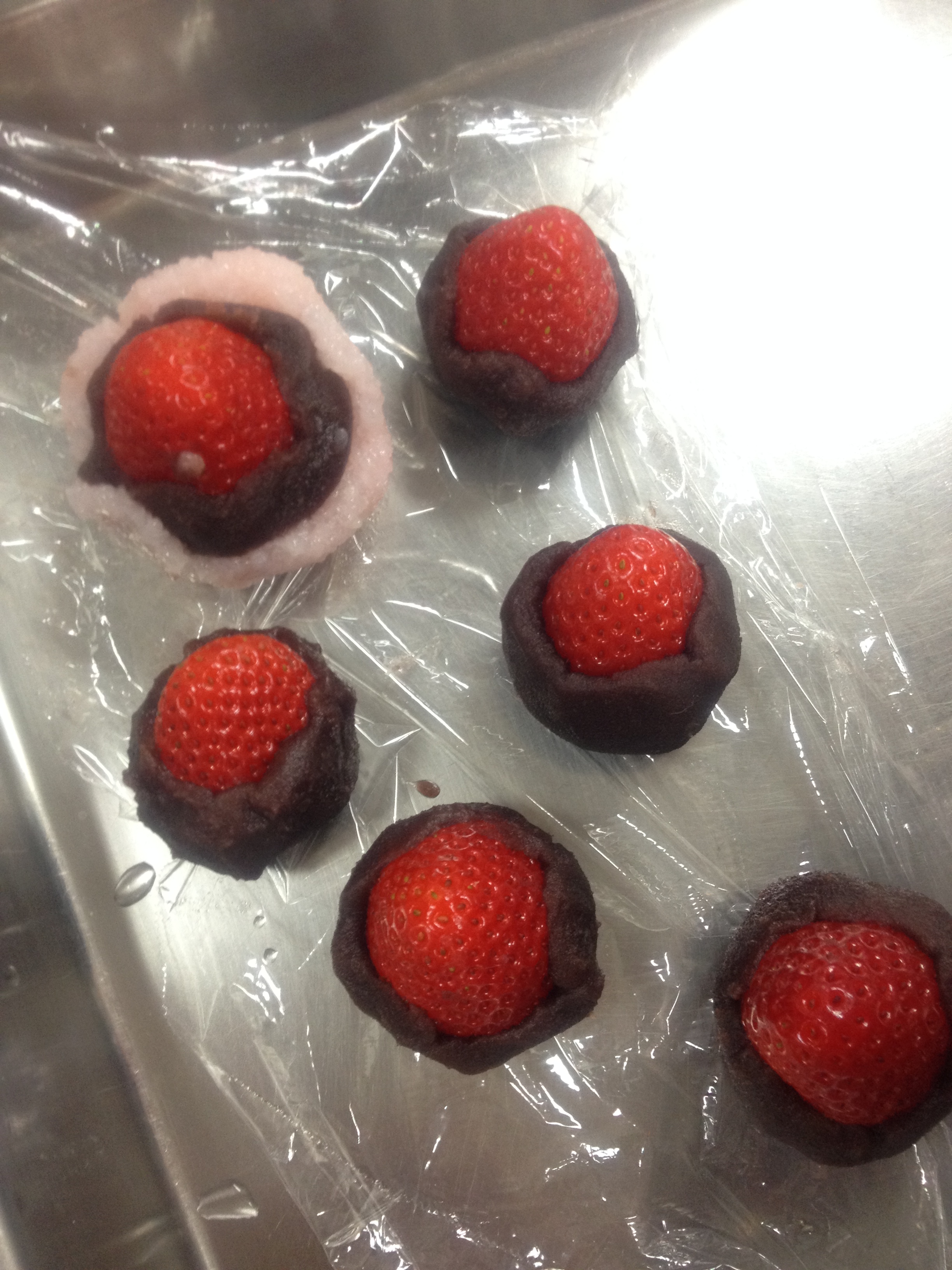 ③ Form the red bean paste into 5 quantities of 15g each. Remove the strawberry stems and leaves. Enclose the strawberries in red bean paste, leaving only the tops exposed. Now wrap each in the rice dough. If the dough is sticky and hard to work with, try wetting your hands.