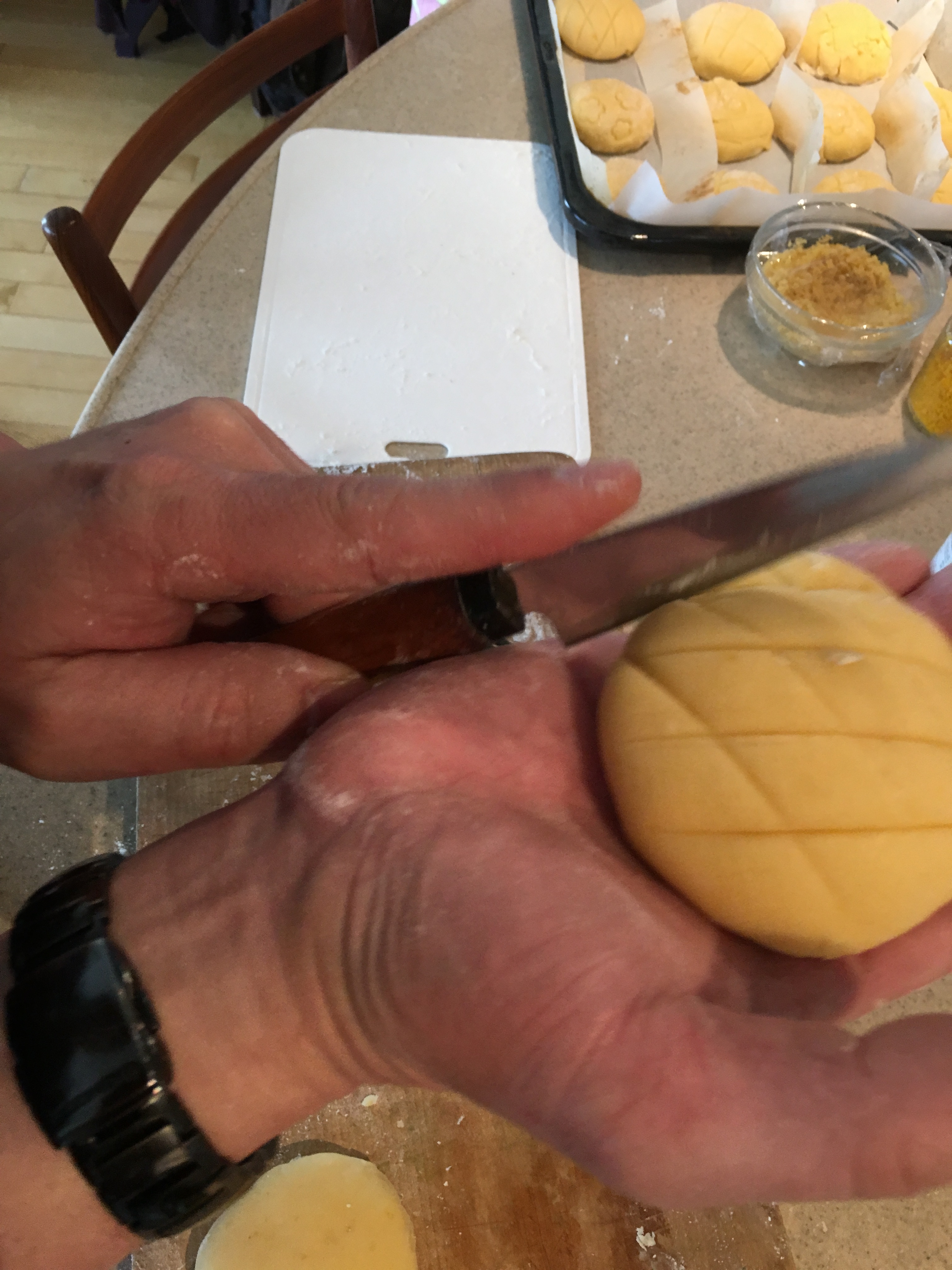 7. Wrap each of the pieces of external dough around a ball of internal dough. Use a knife to cut a crosshatch pattern into the external dough.