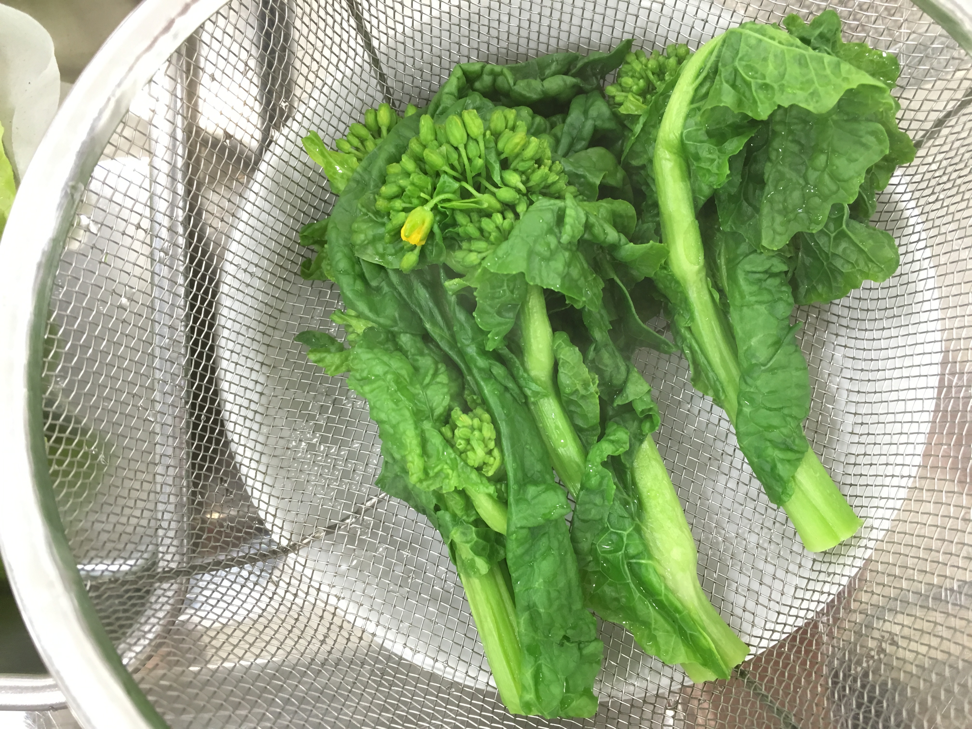 1. Boil the na-no-hana in salted water for about 30 seconds. (The salt is not included in the recipe above and just a pinch will do.) Remove the na-no-hana to a strainer and let it cool.