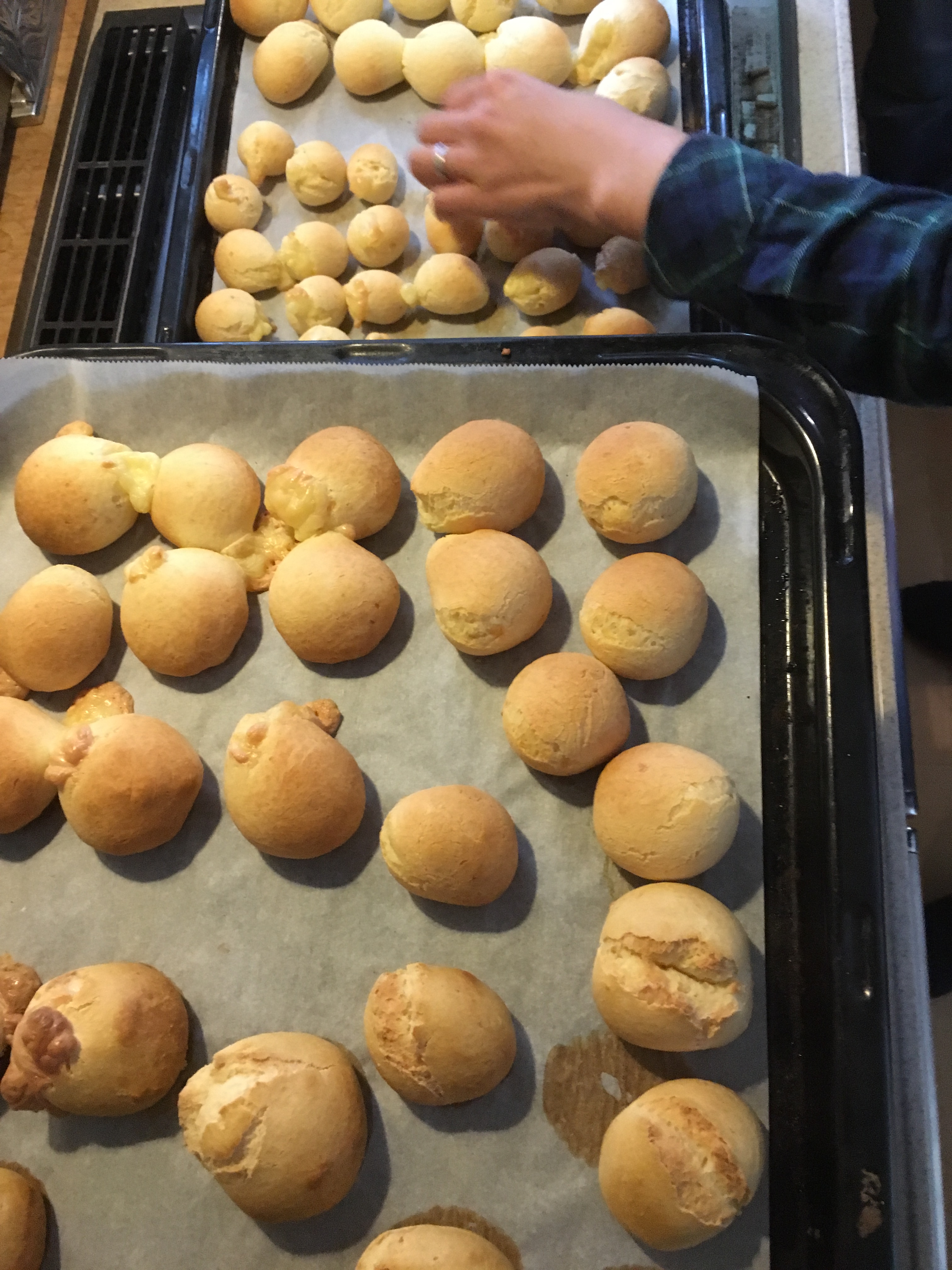 Pão de queijo originated in Brazil by about the 18th century – exactly when is unclear, perhaps because it was created by African slaves. By the 1950s, it had spread throughout Brazil. Since then it has become popular in other parts of the world, as well. “Pão de queijo” is Portuguese and simply means “cheese bread.” Brazilians make it at home and often eat it for breakfast. Recipes for pão de queijo are many and varied. They can be made with different flours and different cheeses and oils, as indicated below.