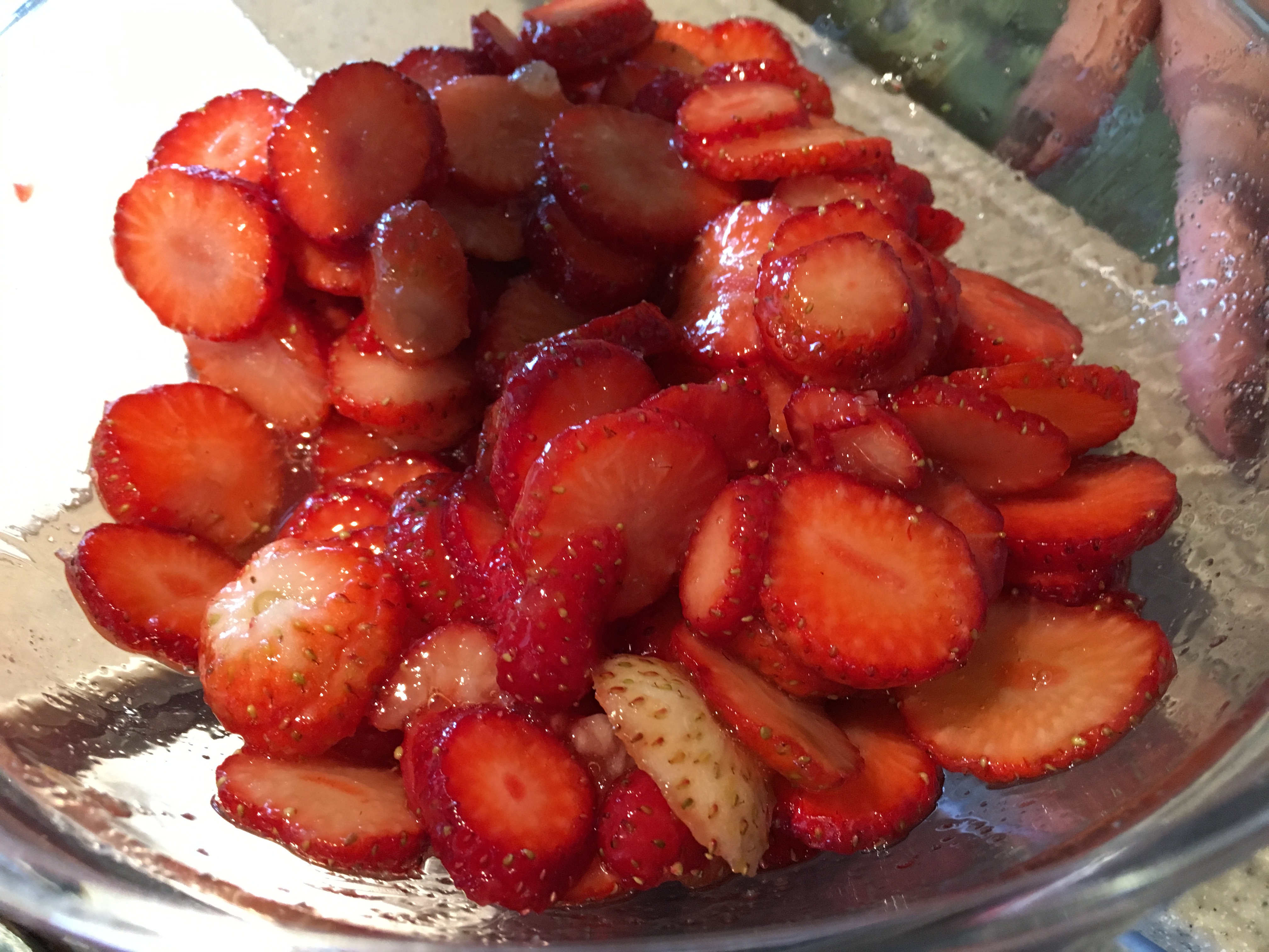 amazake ichigo2. Cut the strawberries crosswise into 5mm-thick slices. Coat them in honey and set them aside for about 1 hour. This will draw water out of the berries. After the berries have sat for about an hour, separate them from the syrup that has resulted and retain both.