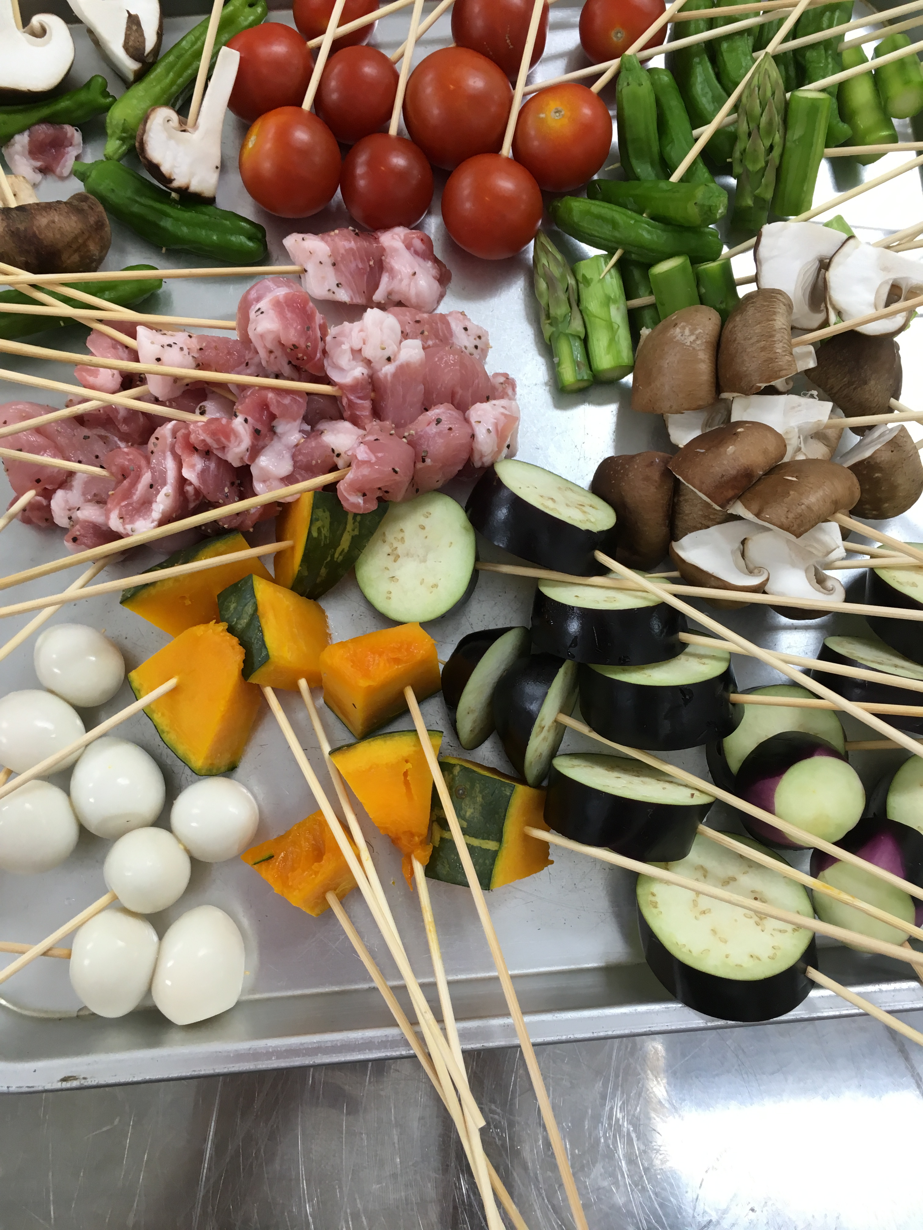 4. Put the meat and vegetables on skewers, with one ingredient per skewer.