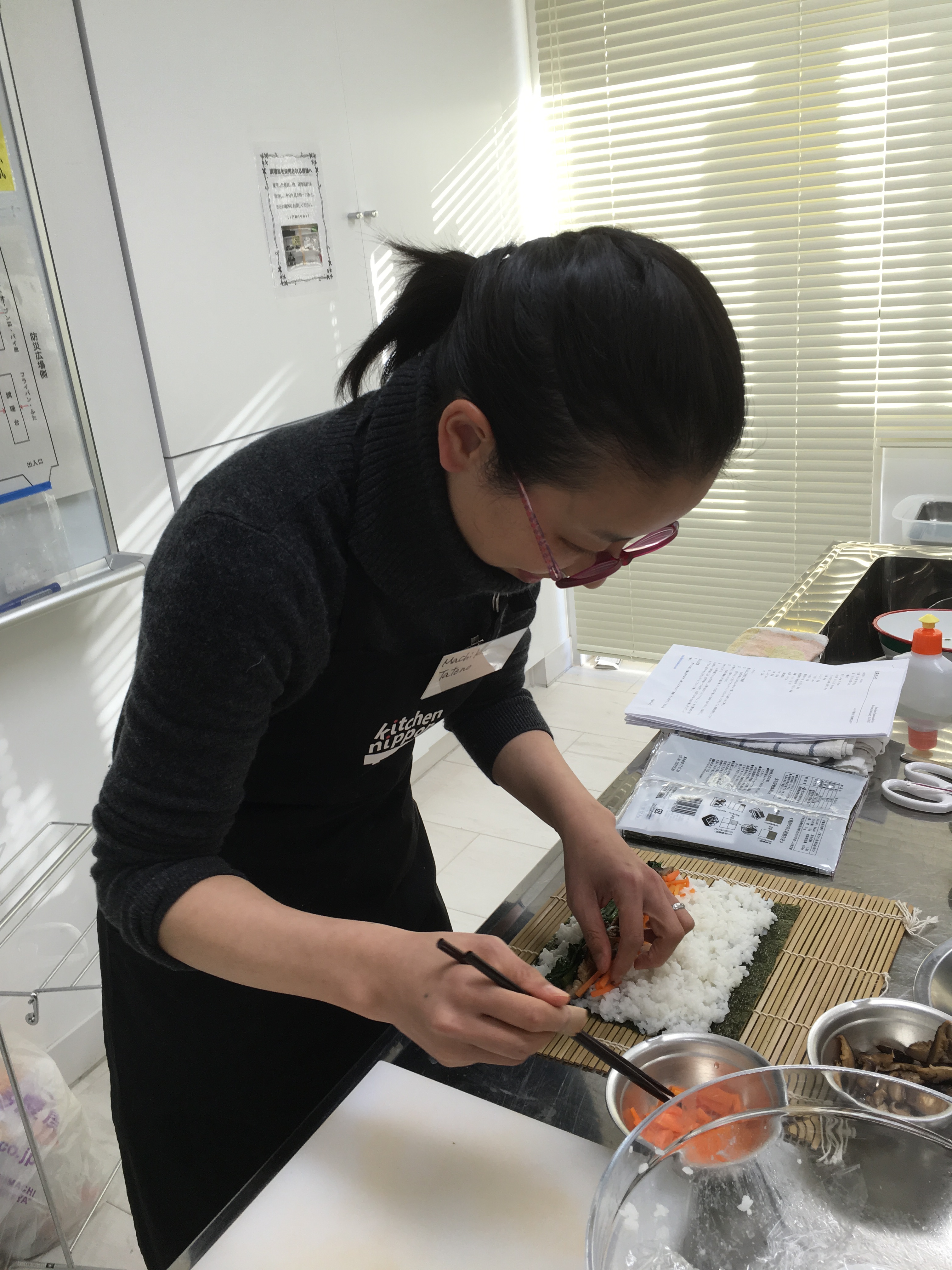 6. Begin rolling. Start with the edge of the makisu closest to you and begin rolling away from your body, using your fingers to make sure the carrots, kimchee, etc. wind up in the center of the roll. Use firm, even pressure to form the roll. Place the roll on a cutting board with the seam down. Wipe a knife with a damp towel and begin cutting the roll into easy-to-eat pieces. Wipe the knife with the damp towel after every cut. Repeat from step 5.