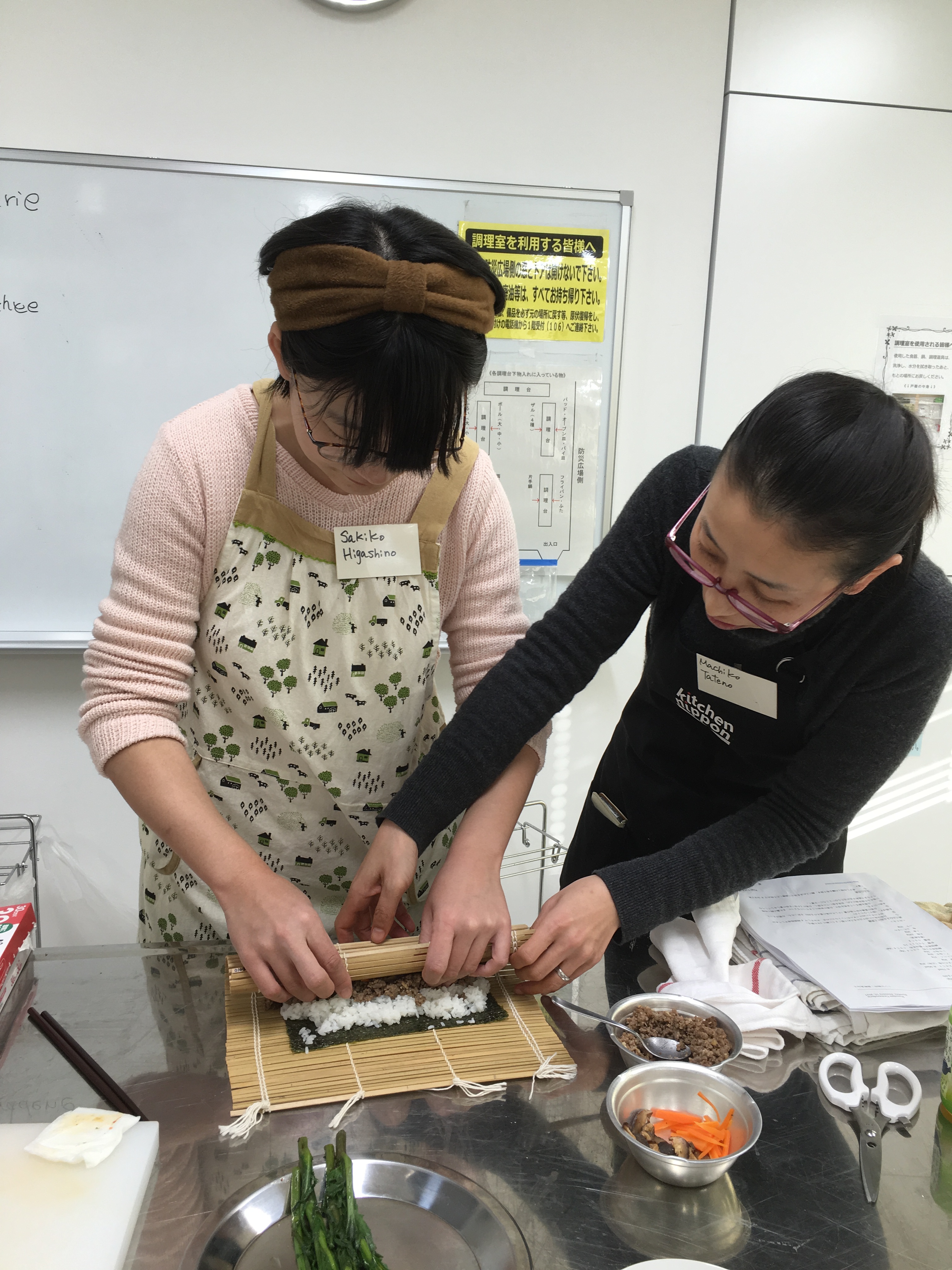 5. Place one sheet of nori on a makisu. Add half of the cooked rice, spreading it out into a thin layer. Cover the left and right sides of the nori, but leave about 1 cm open on the edge of the nori closest to you, and about 3 cm open on the edge farthest from you. Next, starting at the edge closest to you, make lines of carrots, kimchee, ground beef/pork, shitake, and chrysanthemum greens, using half of each of these ingredients.