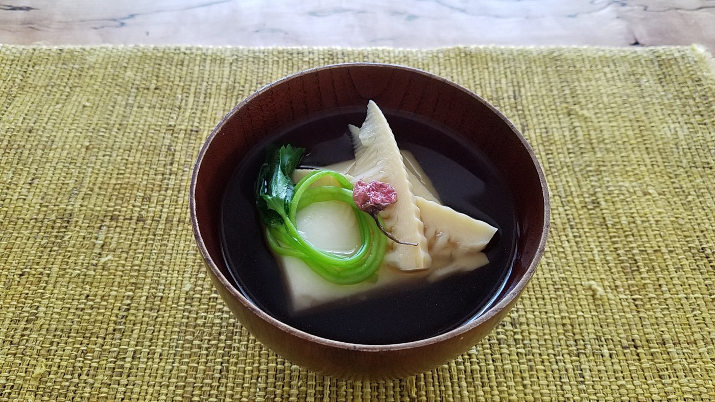 3. Serve the soup in bowls and garnish with the mitsuba and salted cherry blossoms.