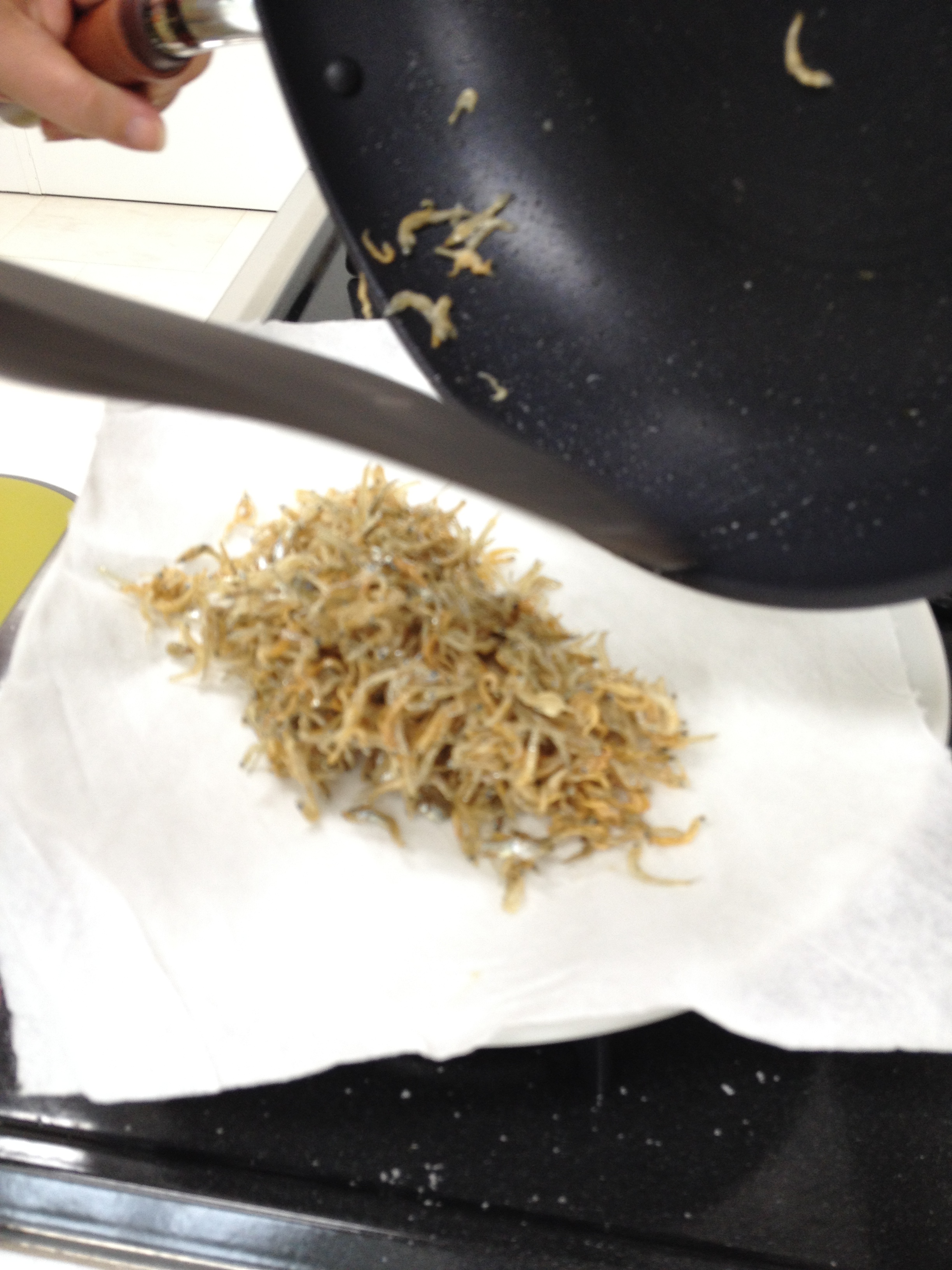 ③ Place a paper towel on a plate or metal tray. Add the sesame oil to a frying pan and put the pan on medium heat. Add the chirimenjako to the pan and fry until they become crispy, then transfer them to the plate or tray to allow the paper towel to absorb the excess oil.