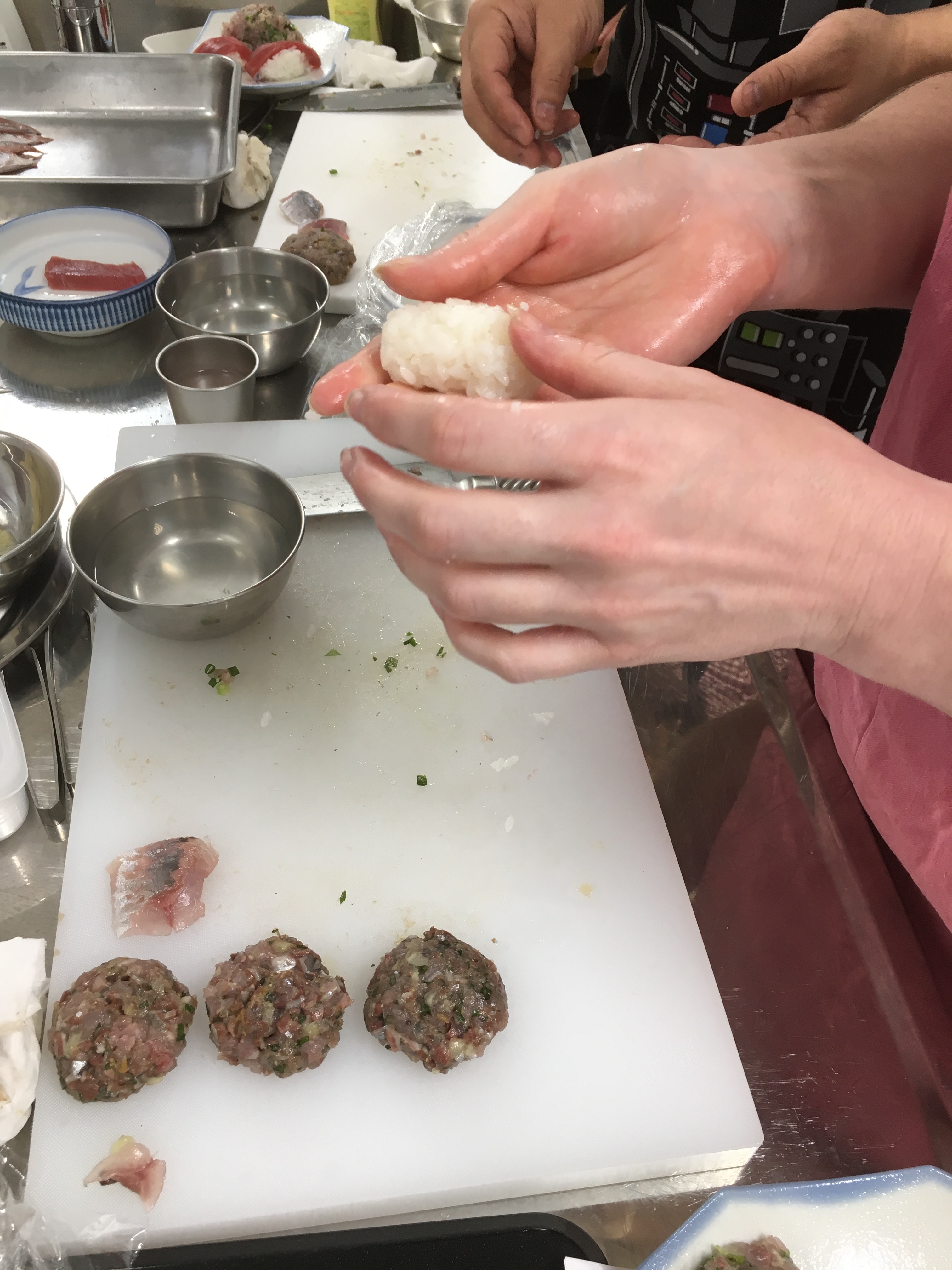5. Add the vinegar and water to a small bowl. This mixture is called “tezu.” Assuming you are right handed, dip your right-hand fingers in the tezu and then use your right hand to grab about 20 g of the sushi rice. Gently form the rice into an oblong shape about the size of a couple grapes placed end to end. Pick up a piece of aji with your left hand, positioning it so that it is skin side down and lying across the middle joints of your fingers. Now place the sushi rice on top of the aji and use your right index finger to gently press down on the middle of the rice. Turn the whole thing over so that the aji is on top and use your right thumb and index finger to gently compress both sides of the nigirizushi and correct its shape. Next, use your right-hand index and middle fingers to gently press the aji down onto the rice, correcting the shape as you do so. Rotate the nigirizushi 180° and repeat. Finish by placing a small amount of grated ginger on top of the aji and arranging your nigirizushi on a serving plate.