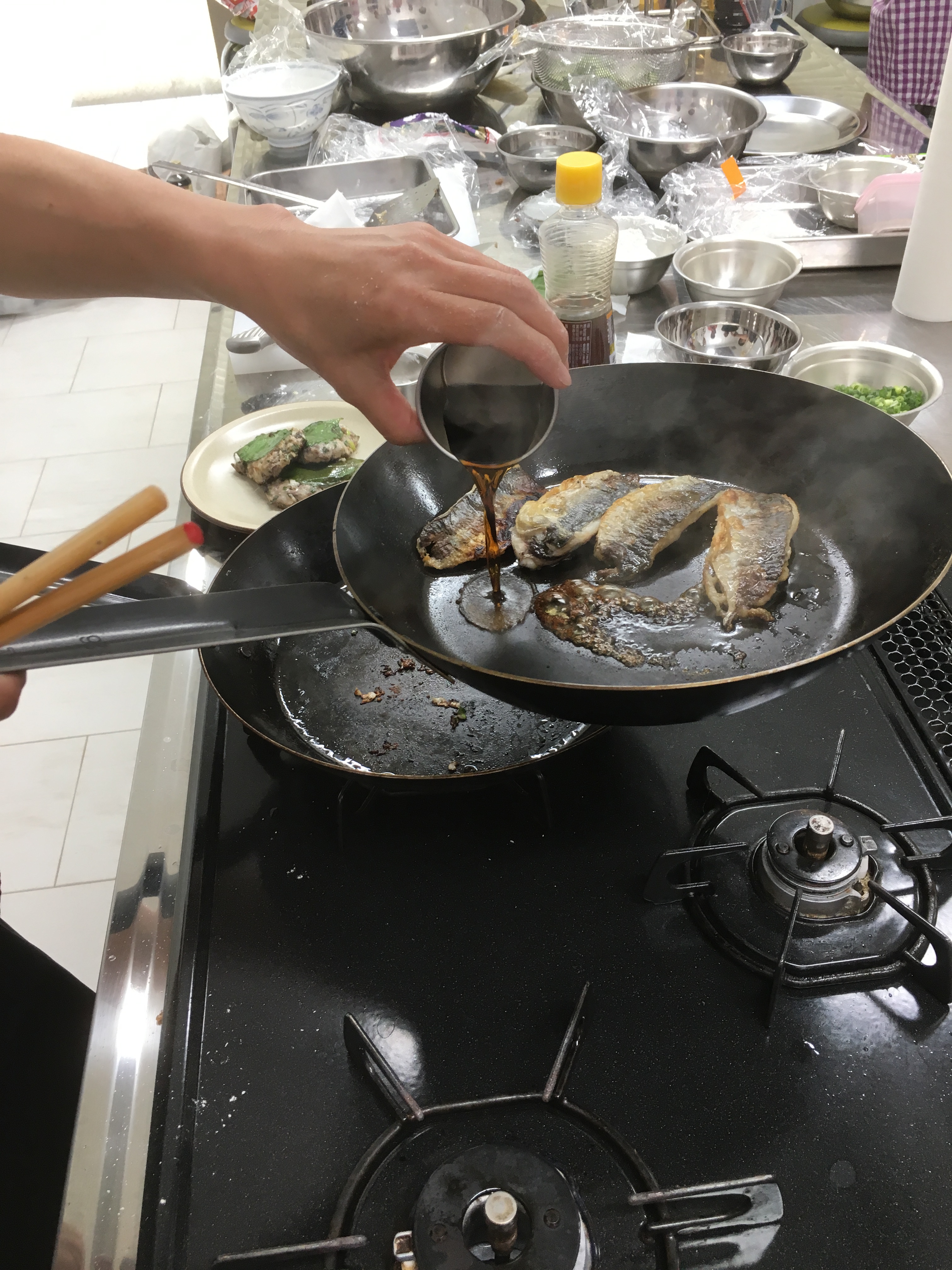 5. Once the skin side is browned, flip the fillets. When the fillets are about 70% done, add the sauce to the frying pan and reduce to low heat. Coat the fillets with sauce. Flip them to ensure even coverage. Form beds of rice on four dishes.