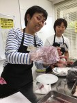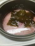 1. Rinse the rice, changing the water and repeating, until the water no longer becomes cloudy. Transfer the rice to a rice cooker, add water up to the “2合” line on the inside of the rice cooker. Add the square of konbu and the umezu, and start the cooker.