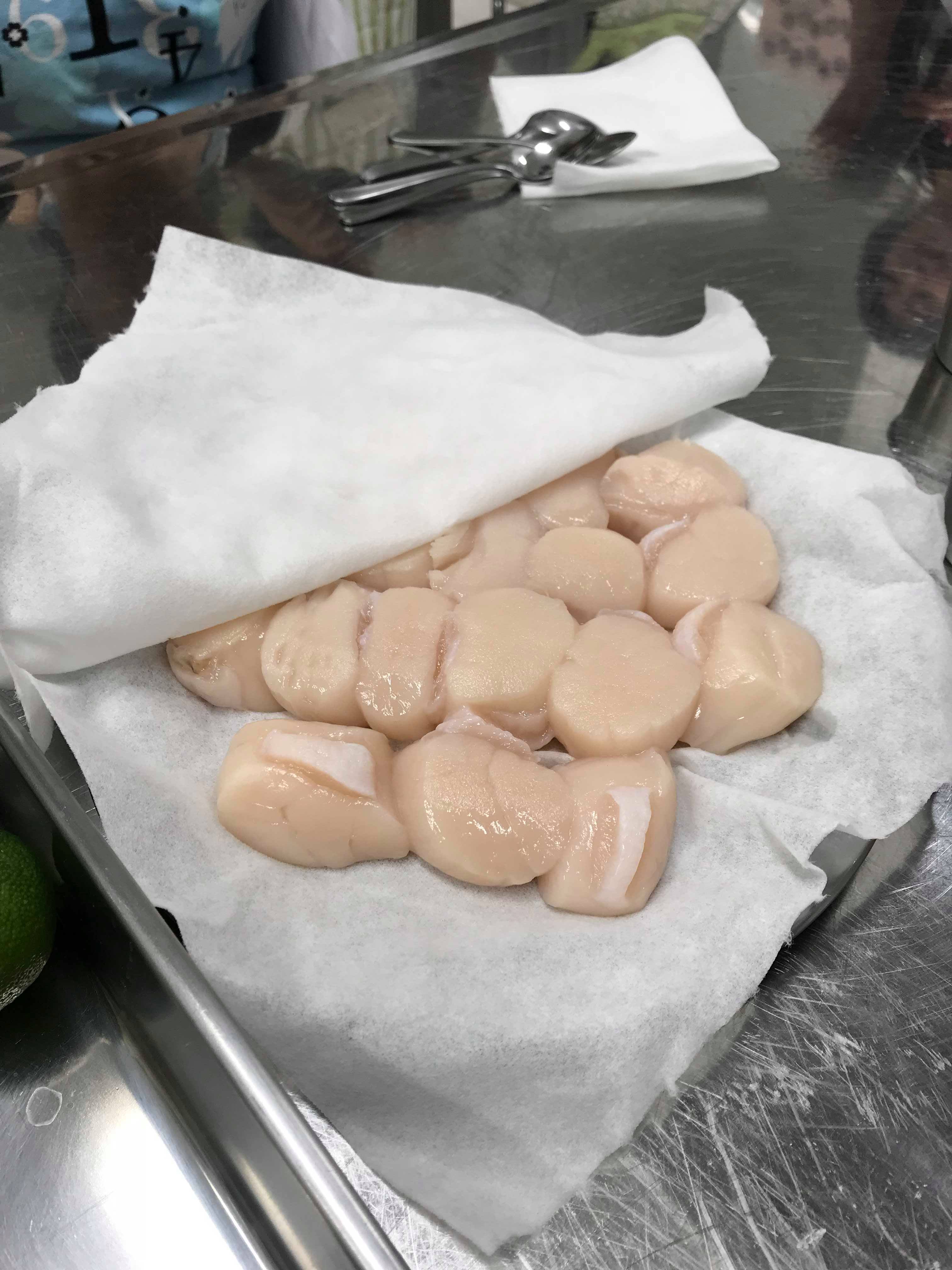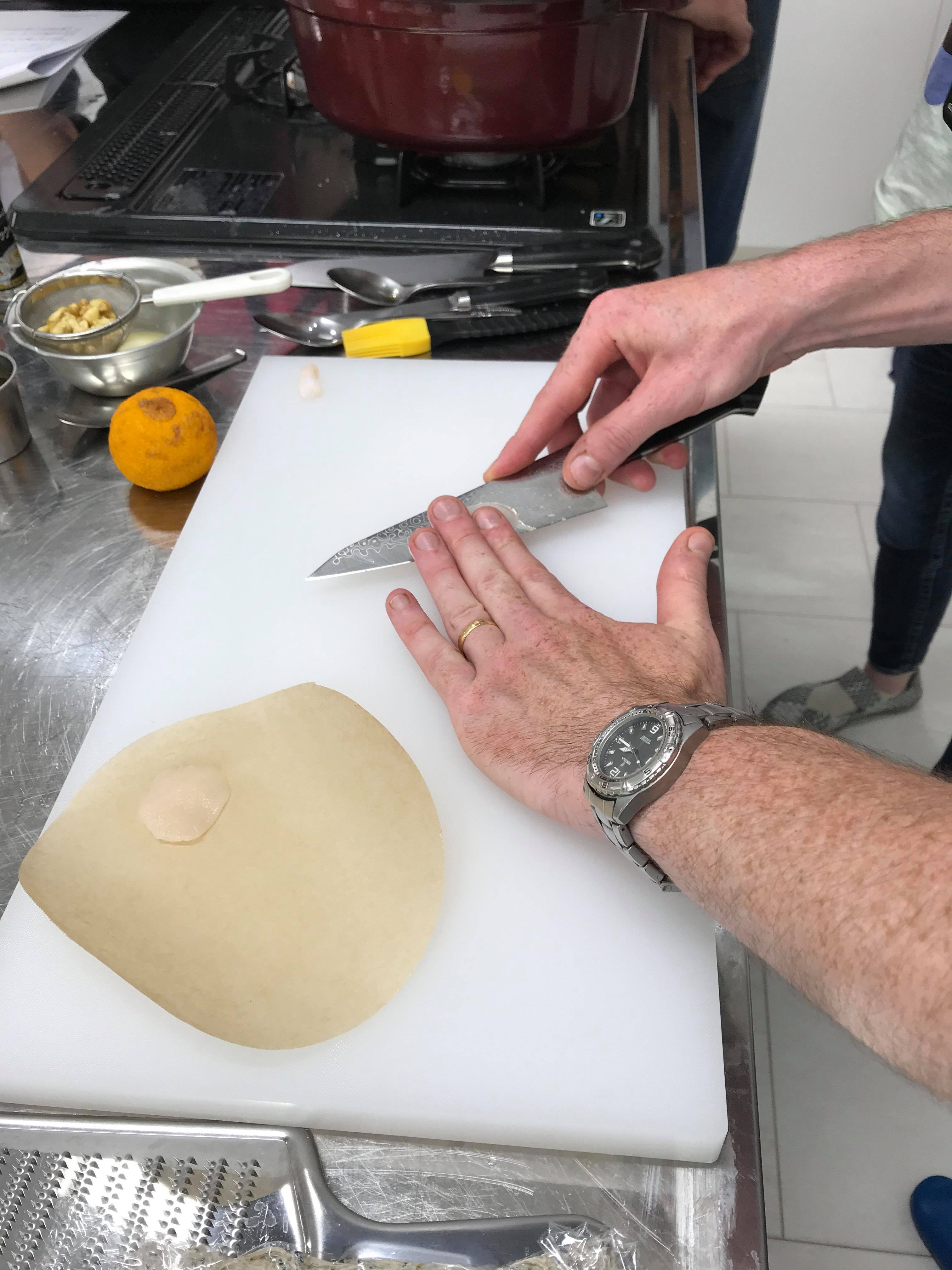 3. Cut the scallops into 4 or 5 slices depending on their thickness. Form the slices into 4 rosettes on a piece of parchment paper. Cover each portion with plastic wrap. Keep these in a refrigerator while you work on other things.