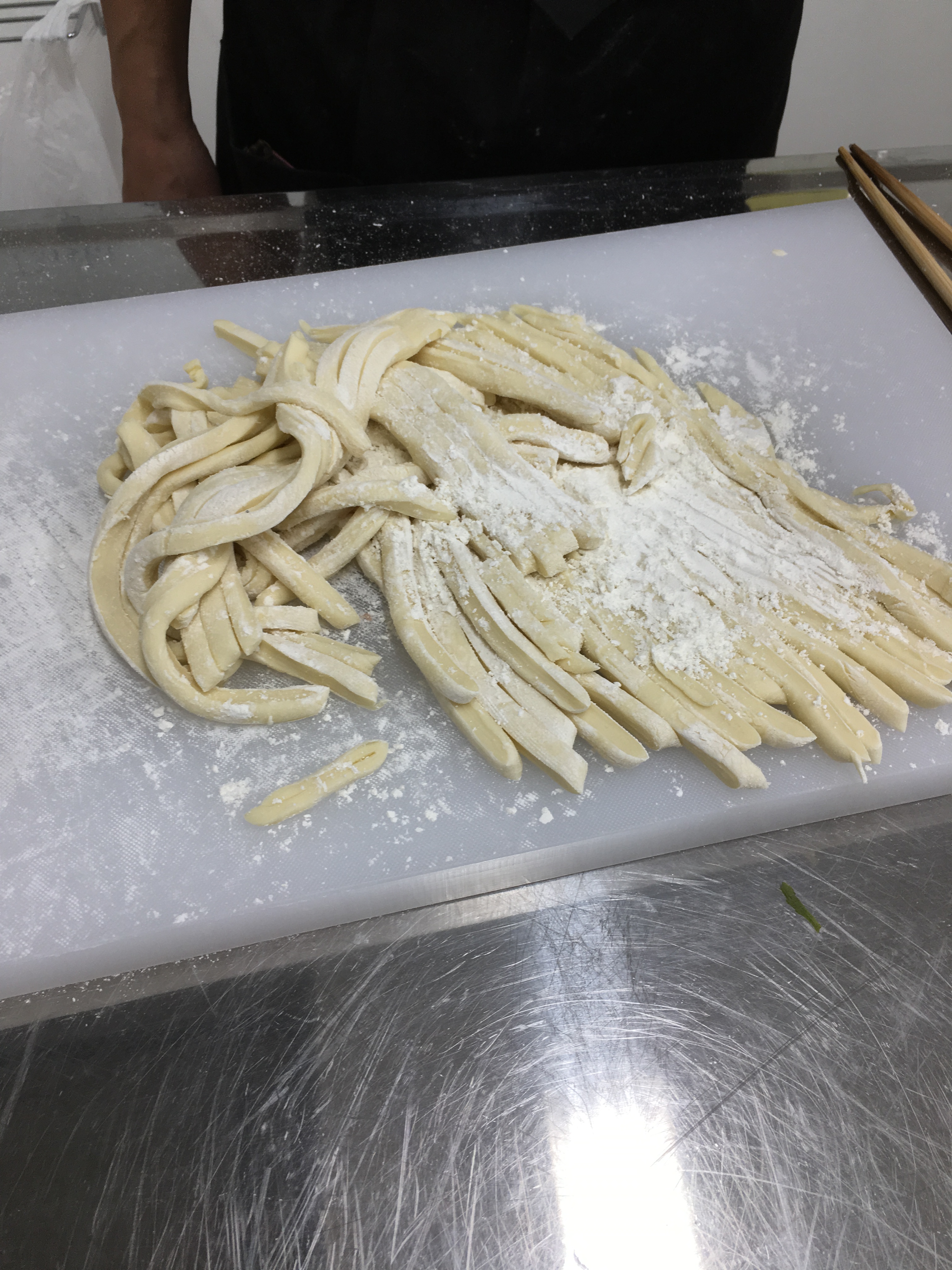 6. Remove the dough from the bag and roll it out into a sheet about 3 mm thick. Dust the dough with flour. Next, fold the top third of the sheet down onto the top of the dough and the bottom third of the sheet up. Cut this trifold configuration into strips 3 mm wide.