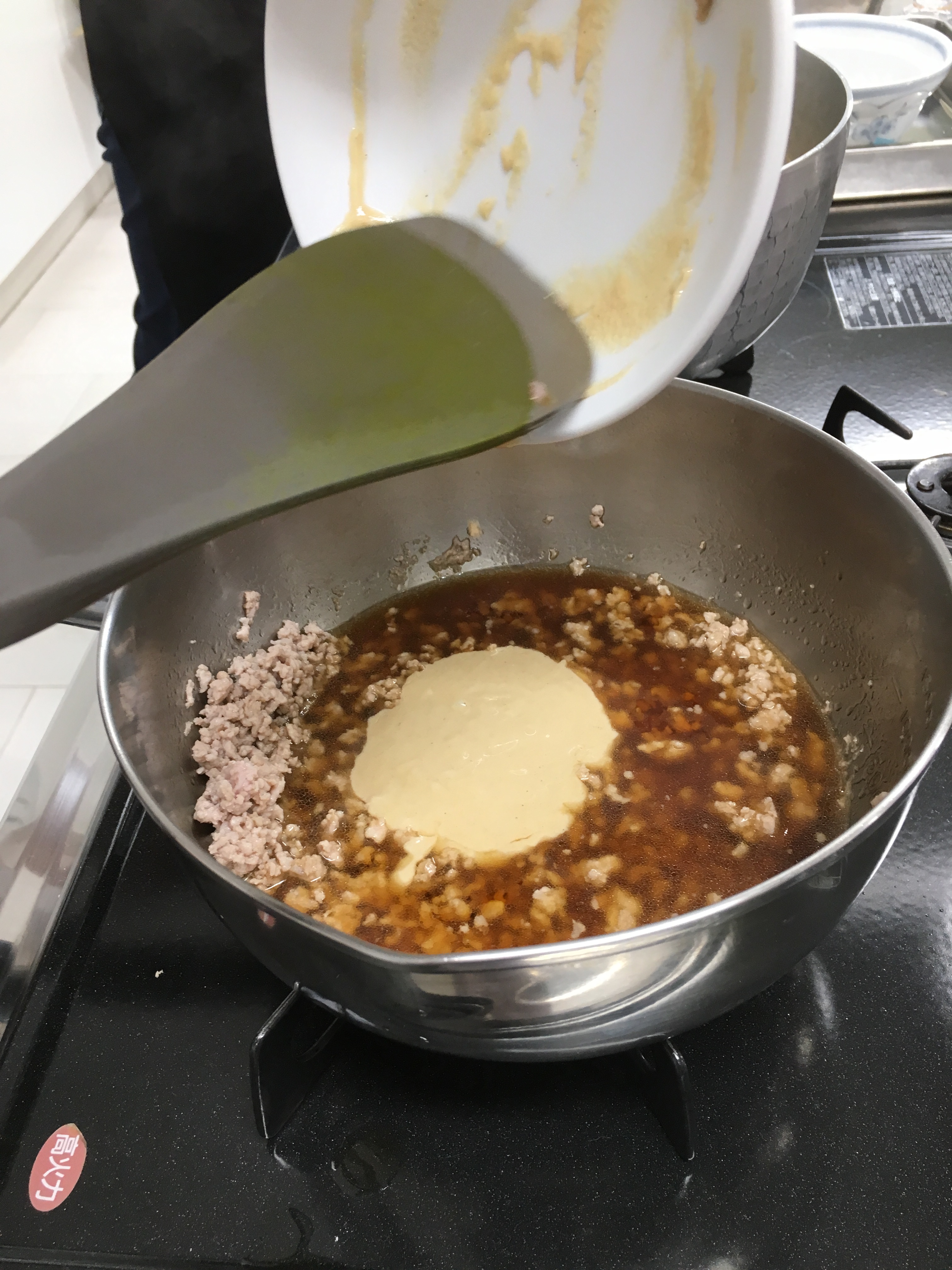 2. When the pork whitens, add the mirin. Let it bubble, then add the men-tsuyu. Lastly, add the sesame paste and mix well.