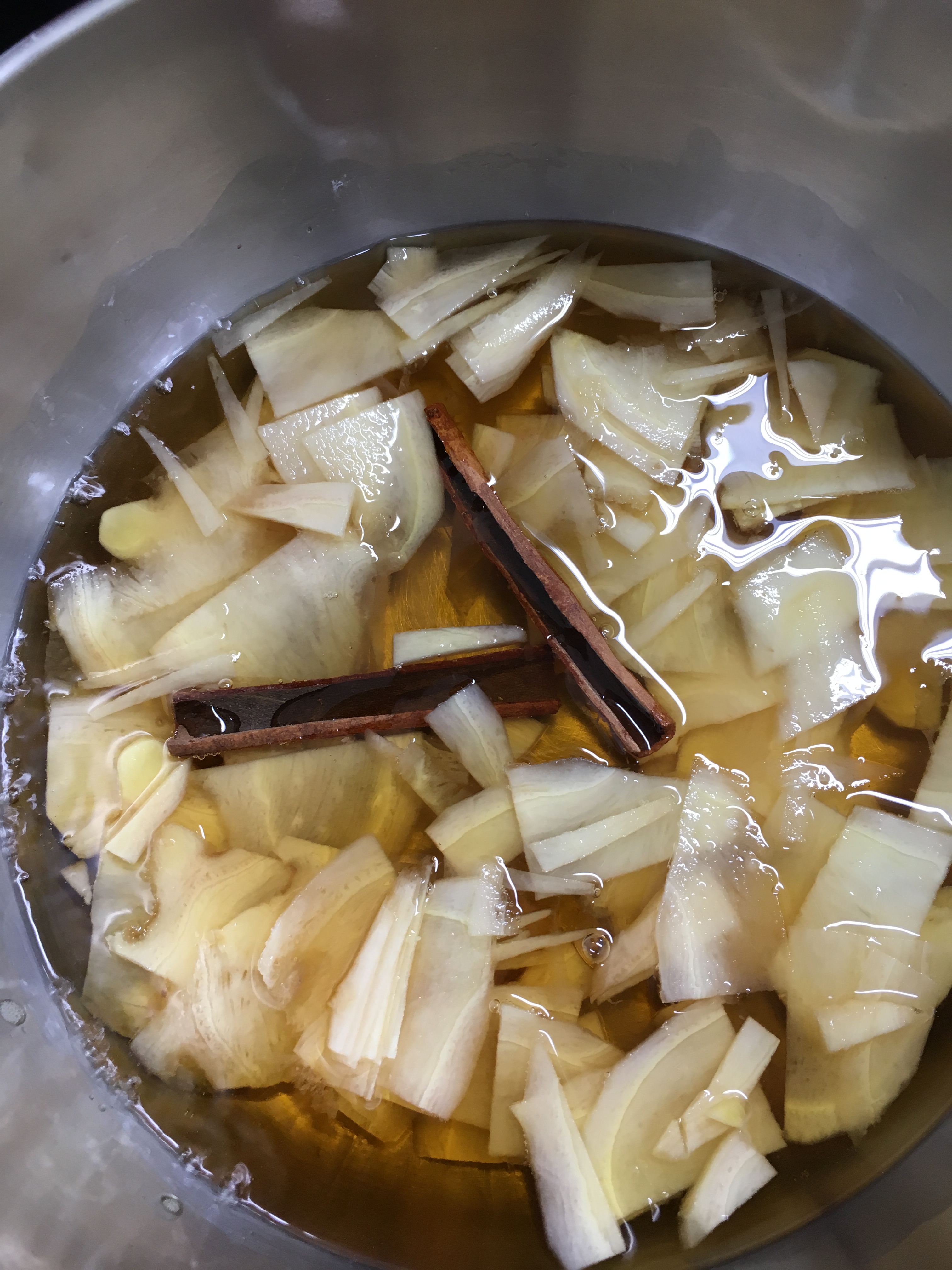 2. Add the mirin, ginger, and cinnamon stick to a pot and place the pot on medium heat. Let the liquid come to a boil then reduce the heat. Reduce the liquid to 2/3 of the original volume, then add the lemon juice. Bring the liquid come to a boil then turn off the heat.