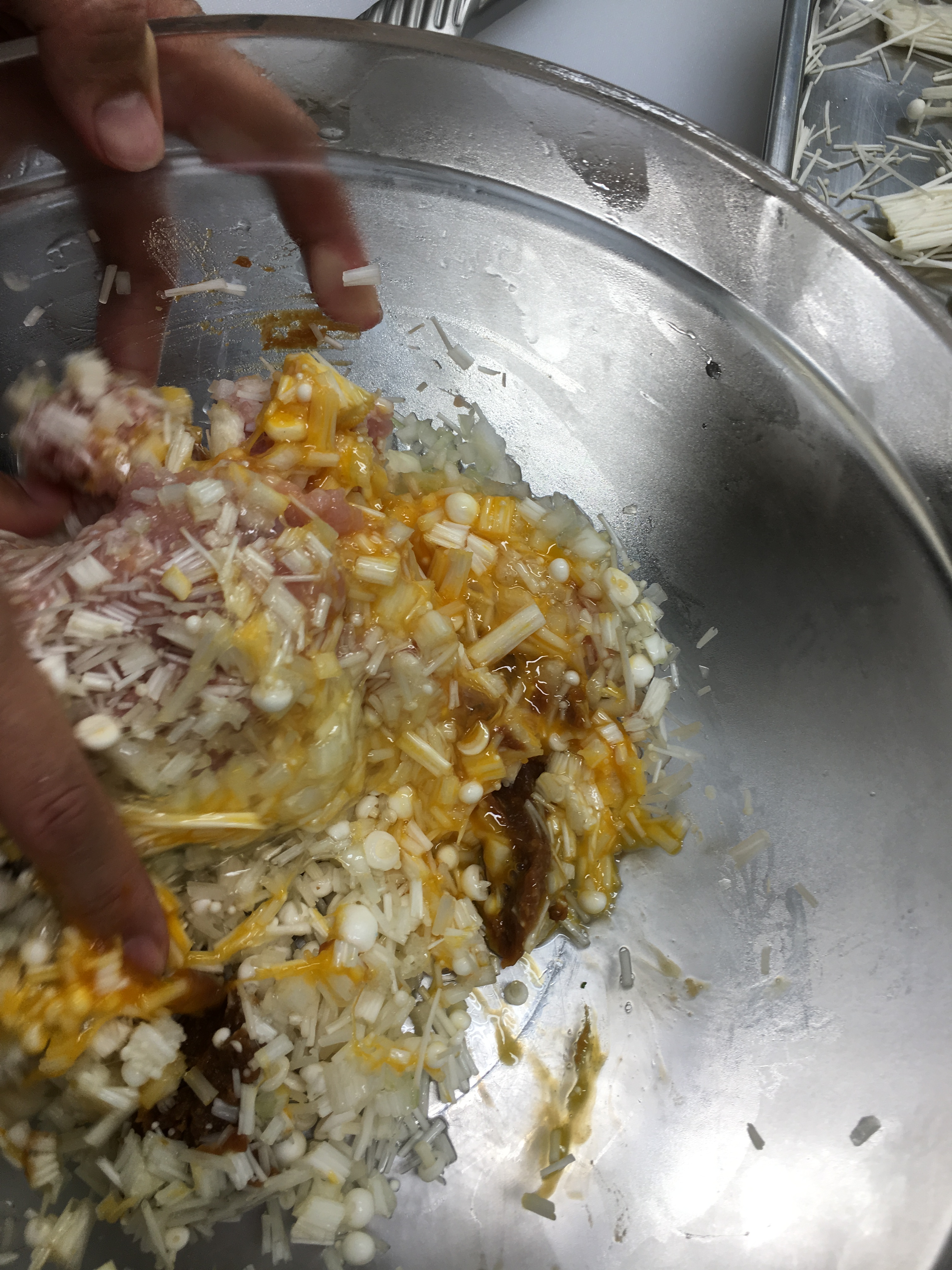3. Mince the onion. Remove the roots from the enoki mushrooms and cut the mushrooms in 5-mm lengths. Grate the ginger. Add the ground chicken, onion, mushrooms, grated ginger, egg, and miso to a mixing bowl and mix until you get a pasty texture.
