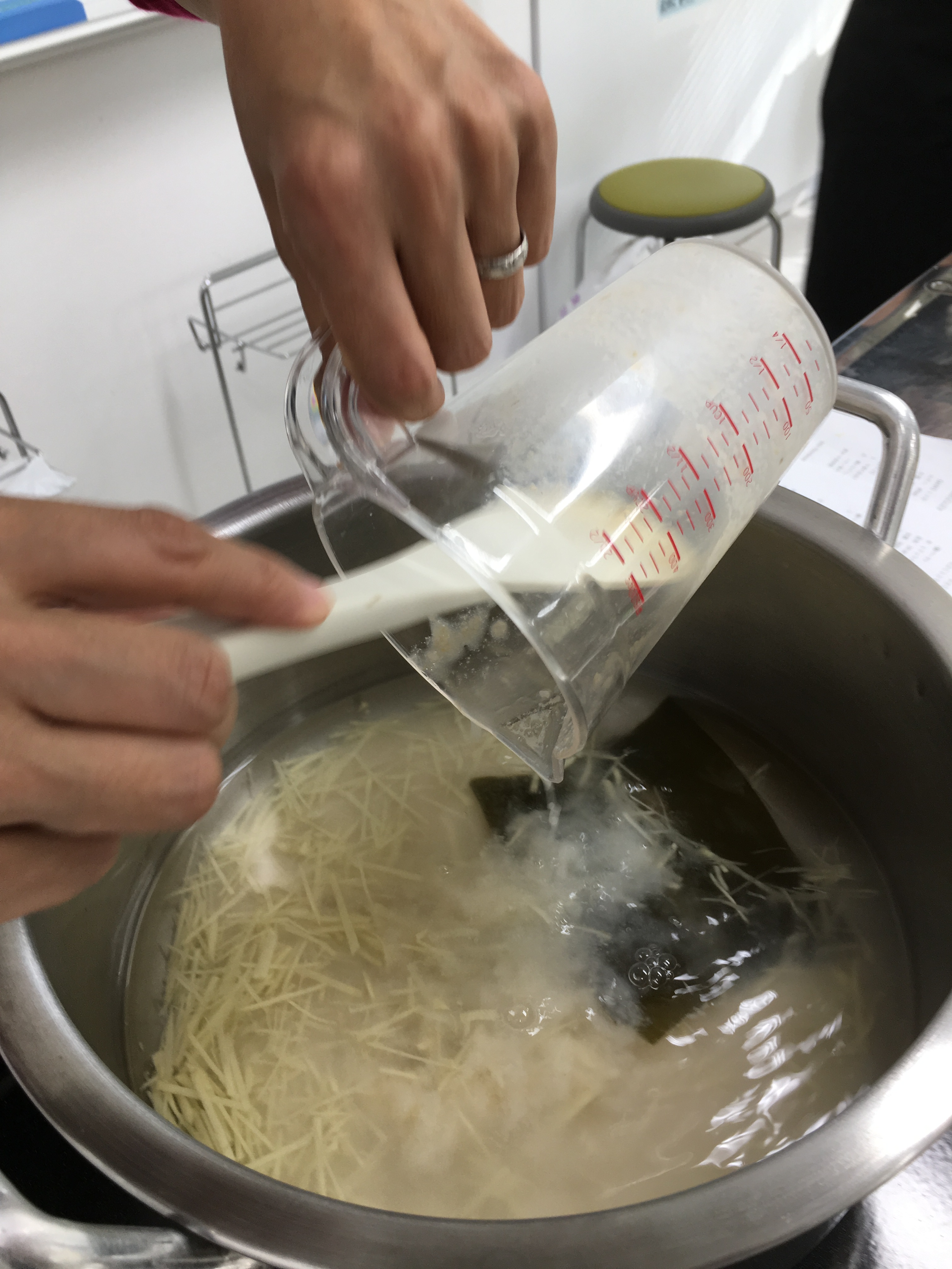 1. Add the water to a pot, put the konbu into the water and let it soak for at least 30 minutes. Peel and julienne the ginger, and add it, together with the amazake and shiokōji, to the pot.