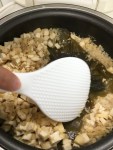 3. Once the rice and other ingredients in the rice cooker have soaked for about 30 minutes, add the light soy sauce, sake, hon mirin, and salt to the rice cooker. Stir to ensure even distribution of the ingredients. Now add the ginger and abura-ageh. Lastly, add the sesame oil and then turn on the cooker.