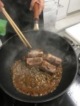 6. When sauce liquid is mostly gone, remove the beef rolls to a cutting board and cut them in half, so that you have 8 rolls.