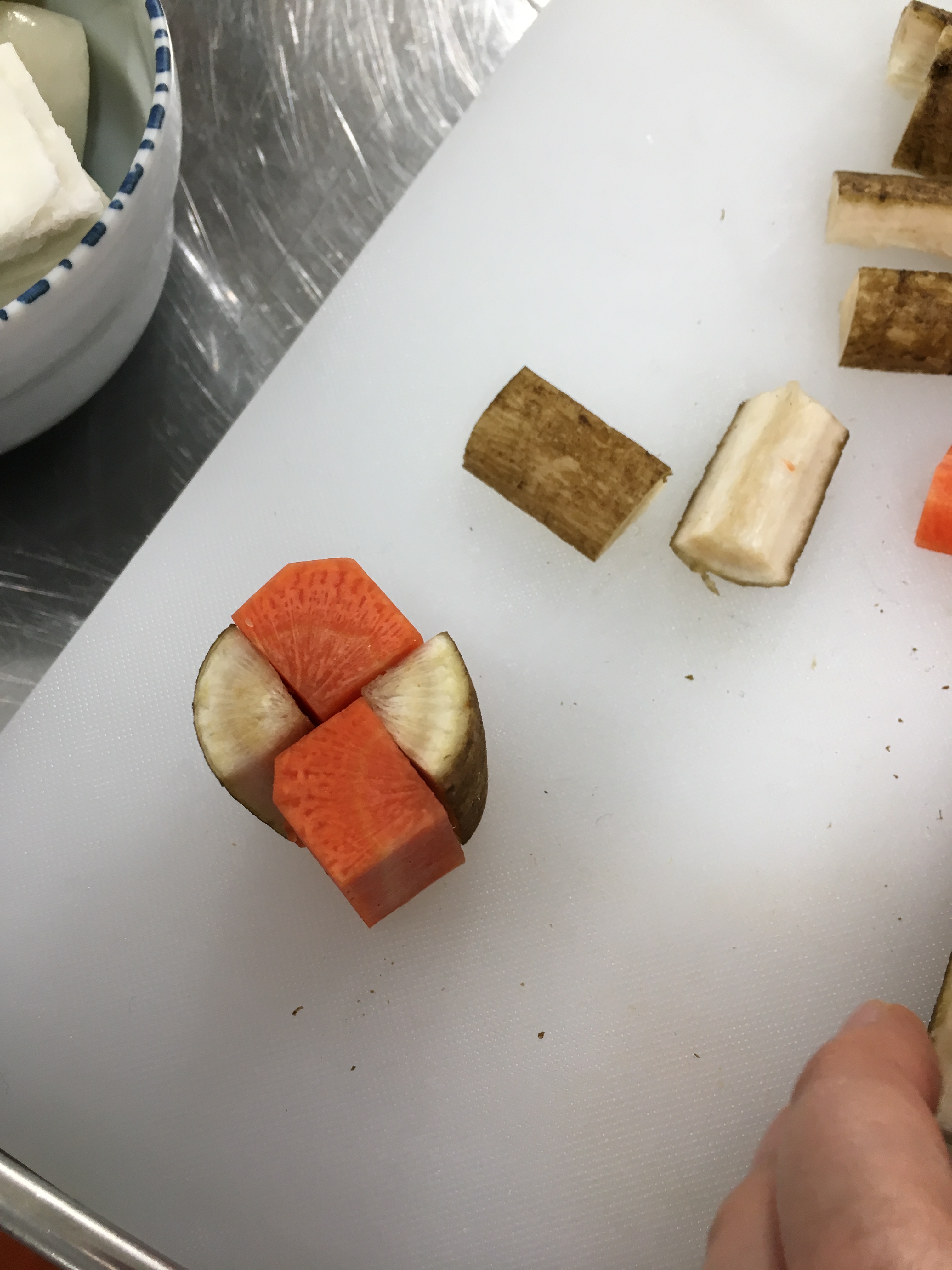 2. Fill a small pot with water and bring it to a boil. Add a pinch of salt and boil the burdock root and carrot sticks for 3 minutes. Drain off the water and let these cool. In a small bowl, mix together the soy sauce, amazake, and ginger juice to create a sauce, and set it aside.