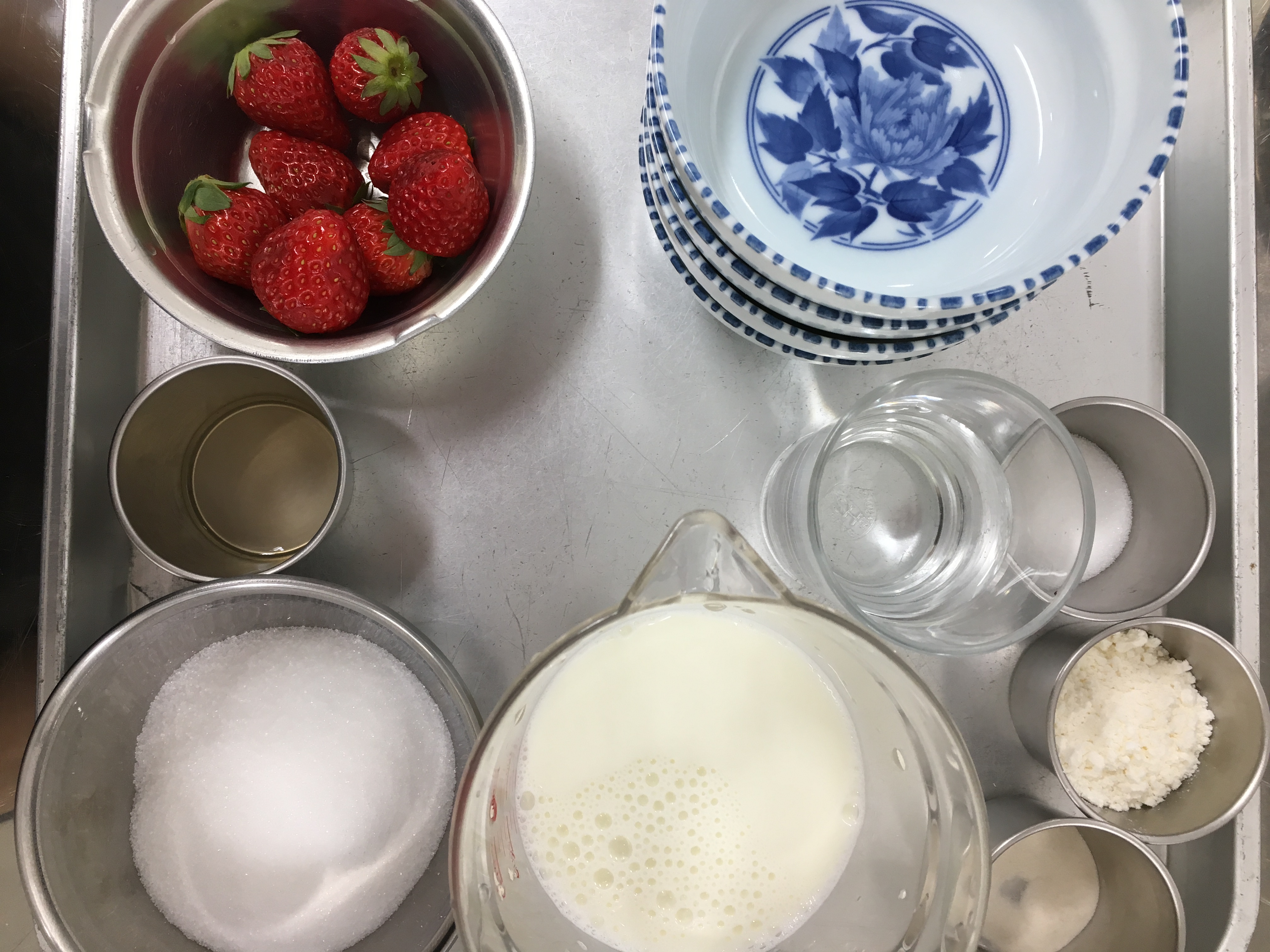 3. Prepare the syrup. Add the granulated sugar (100 g) and water to a second pot, and put the pot on medium heat. Once the sugar has dissolved, turn off the heat, and remove the pot from the burner. Add the lemon juice. Cut the strawberries into cubes 5 mm on a side, add them to the pot, and coat them evenly with the syrup.