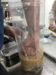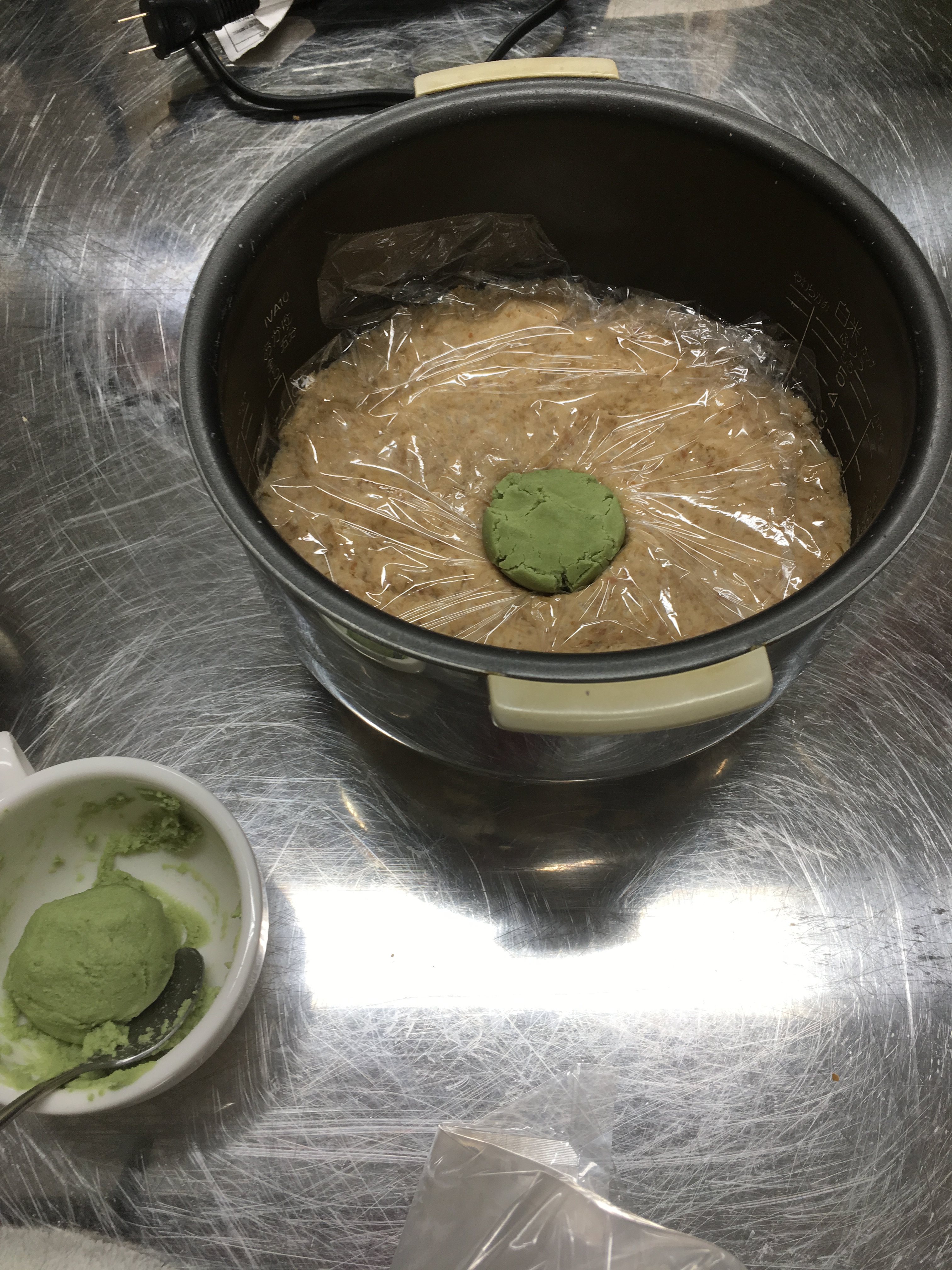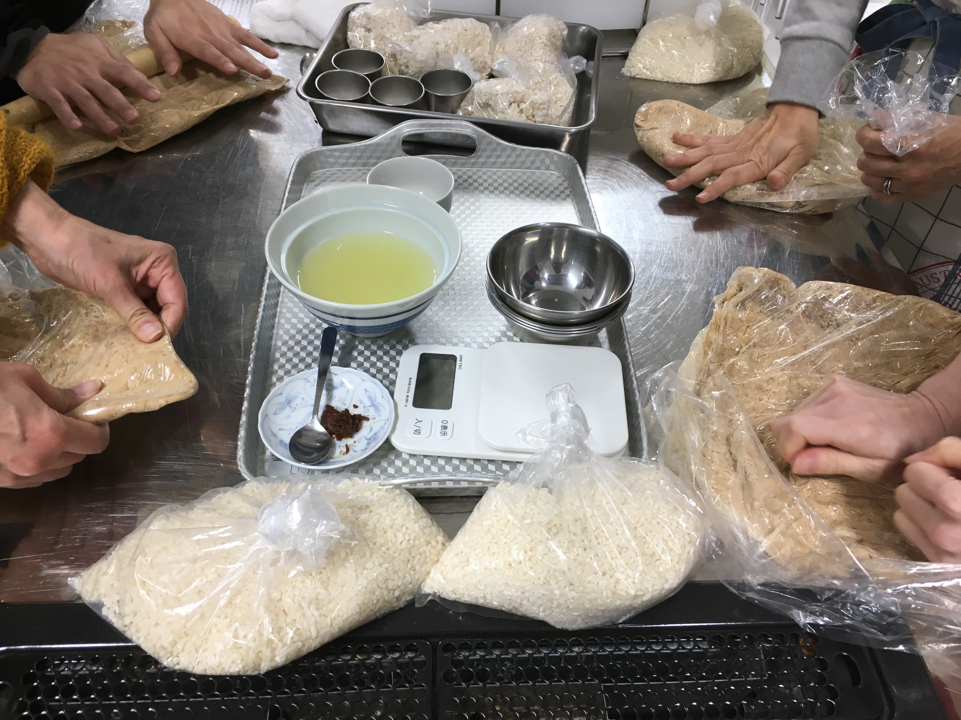 - Once the beans are mashed into a smooth texture, gradually add the mixture of kōji and salt, and mix it into the bean paste. The key here is to get the kōji and salt evenly distributed throughout the bean paste. This is important for preventing the development of mold.