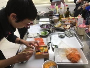 9. Top each square with one of the ingredients you have prepared – the tamago soboro, cabbage and black olives, smoked salmon (Put a little dollop of mayonnaise and a caper on top of the salmon.); and cucumber slices (Place a bit of flying fish roe on top of the cucumber slices.) The point is to use these ingredients to create a mosaic of shapes and colors on top of the sushi rice. When you finish, your mosaic sushi is ready to serve.