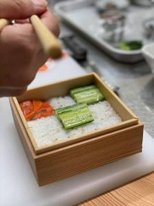 9. Top each square with one of the ingredients you have prepared – the tamago soboro, cabbage and black olives, smoked salmon (Put a little dollop of mayonnaise and a caper on top of the salmon.); and cucumber slices (Place a bit of flying fish roe on top of the cucumber slices.) The point is to use these ingredients to create a mosaic of shapes and colors on top of the sushi rice. When you finish, your mosaic sushi is ready to serve.