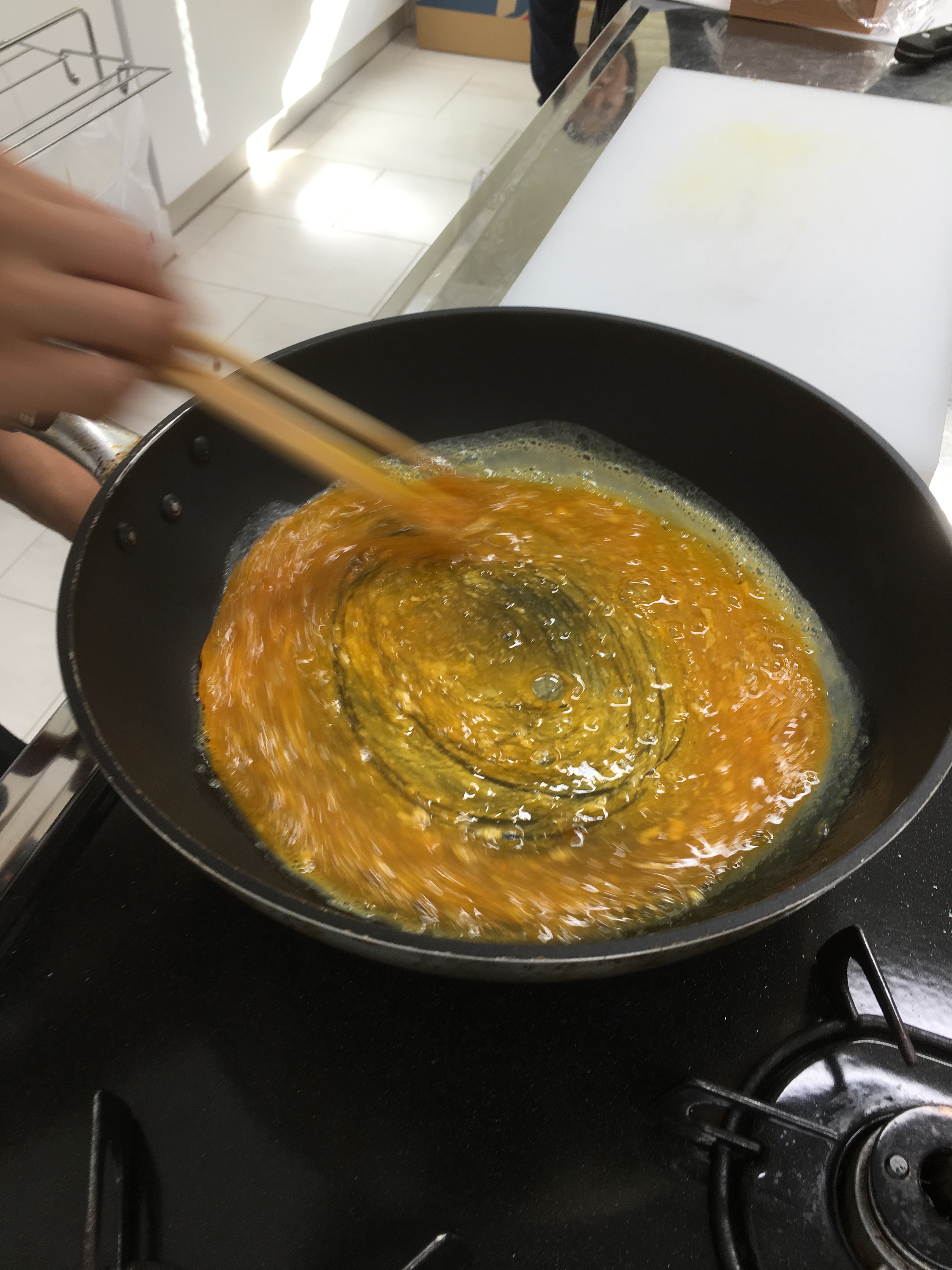 5. Prepare the tamago soboro. To a mixing bowl, add the eggs, water, sugar, and salt, and mix well. Add a bit of vegetable oil to a frying pan and place the pan on medium heat. Once the pan is up the heat, pour in the egg mixture. Stir the eggs as they cook to create a crumbly texture. Remove the cooked egg from the pan and set it aside.