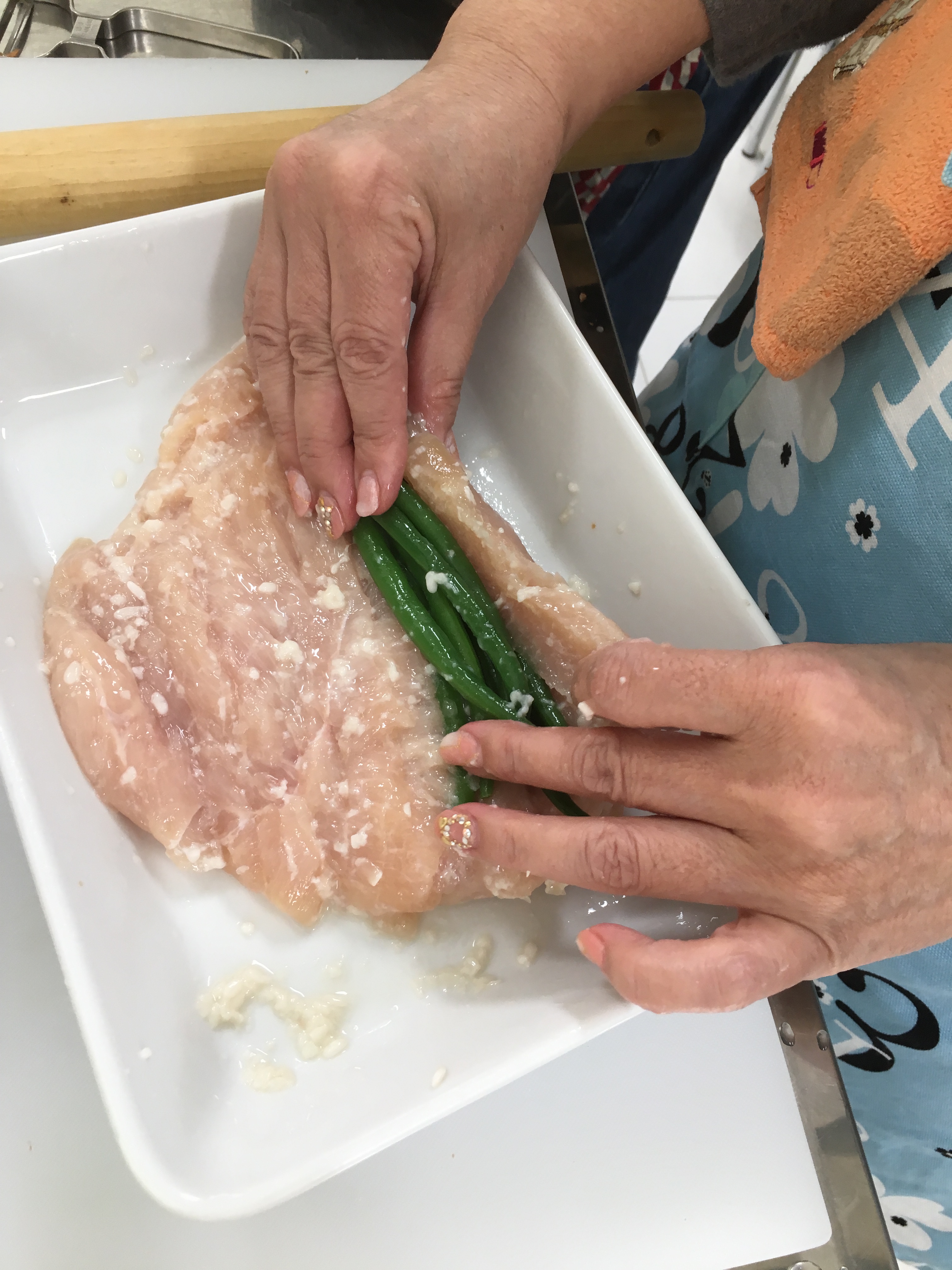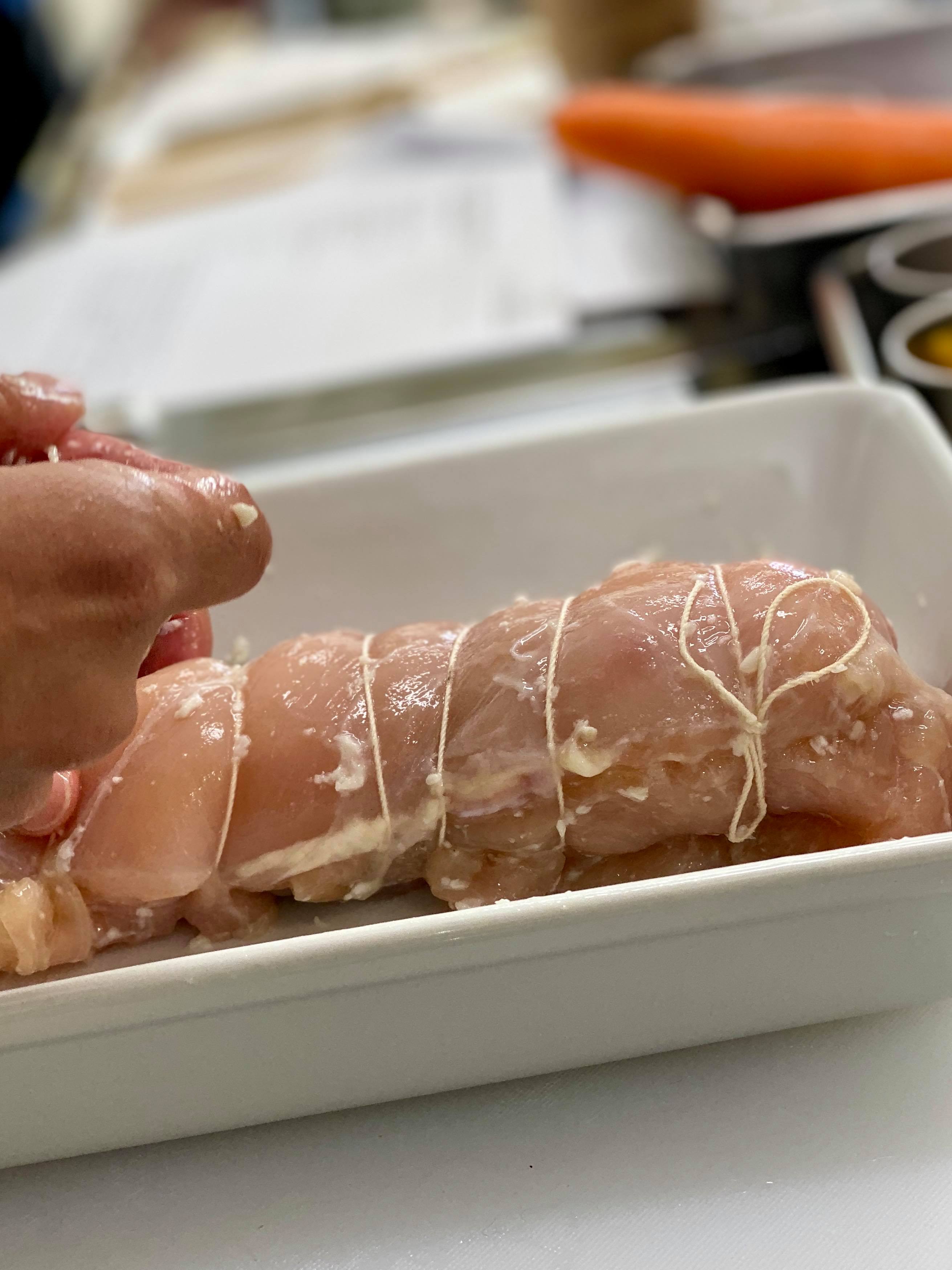 3. Place the string beans on top of the chicken and roll them up. Tie kite string around the roll to hold it together.