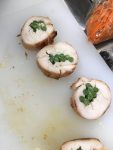 5. When the chicken roll is done cooking, remove it from the oven and cut off the string. Cut the roll into 8 equally sized pieces.