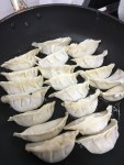 1. Add a dash of sesame oil (not listed in the ingredients) to a frying pan and place the pan on medium heat. Place the gyōza in the pan in straight lines with the broad sides touching one another.