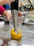 3) Add 130 g of frozen mango to a blender or mixing bowl for use with a hand-held mixer. Add the sugar and 50 ml of water, and mix well. Warm the gelatin in a warm-water bath and then add it to the mango-water-sugar mixture. Mix well. Add the fresh cream and lemon juice, and mix these in well.